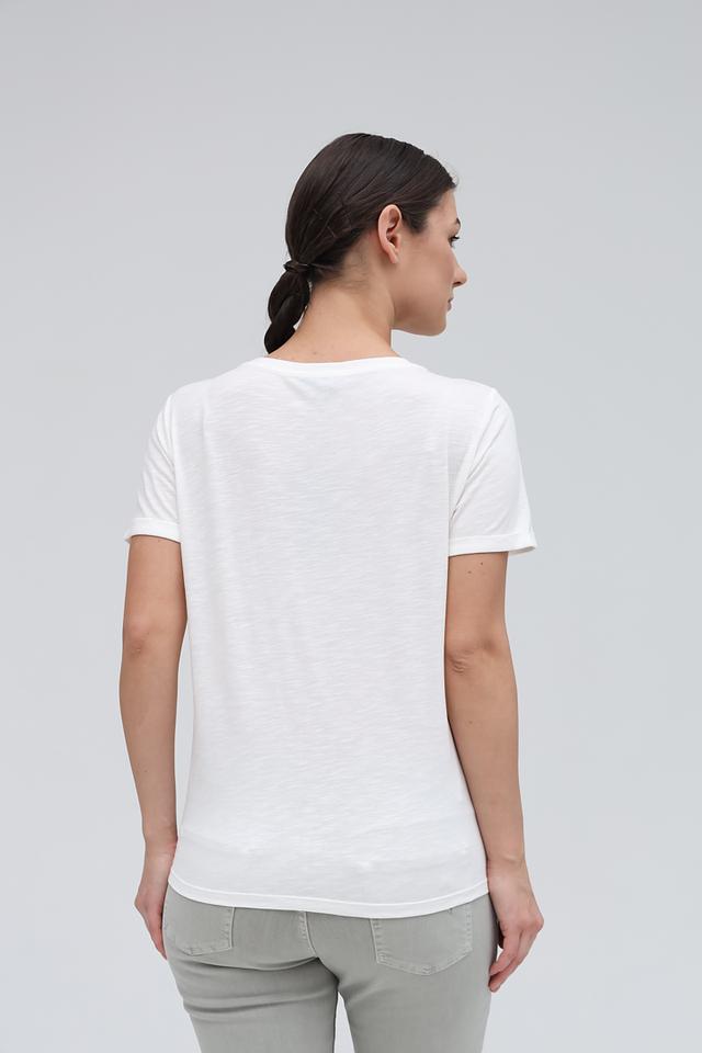 Футболка имеет прямой крой и короткие рукава, что обеспечивает комфорт в жаркую погоду. Округлый вырез горловины подчеркивает женственность силуэта. Модель идеально подходит для создания повседневных образов.