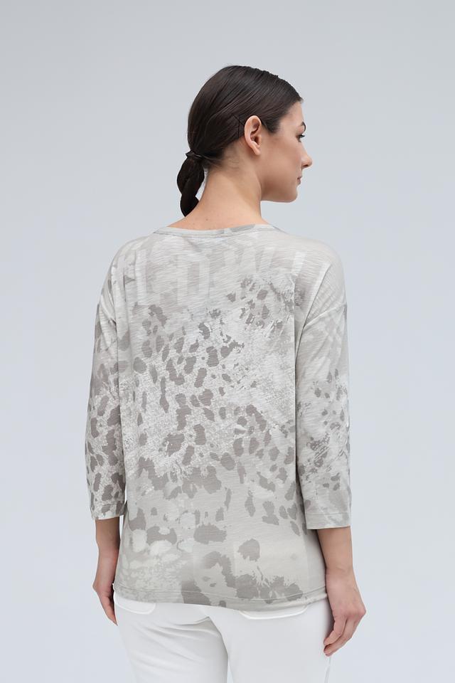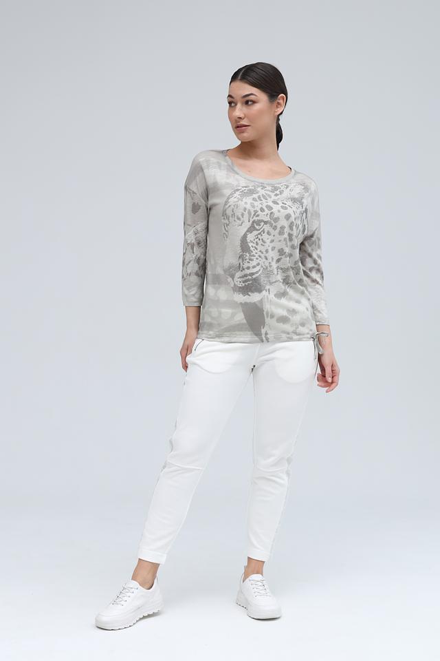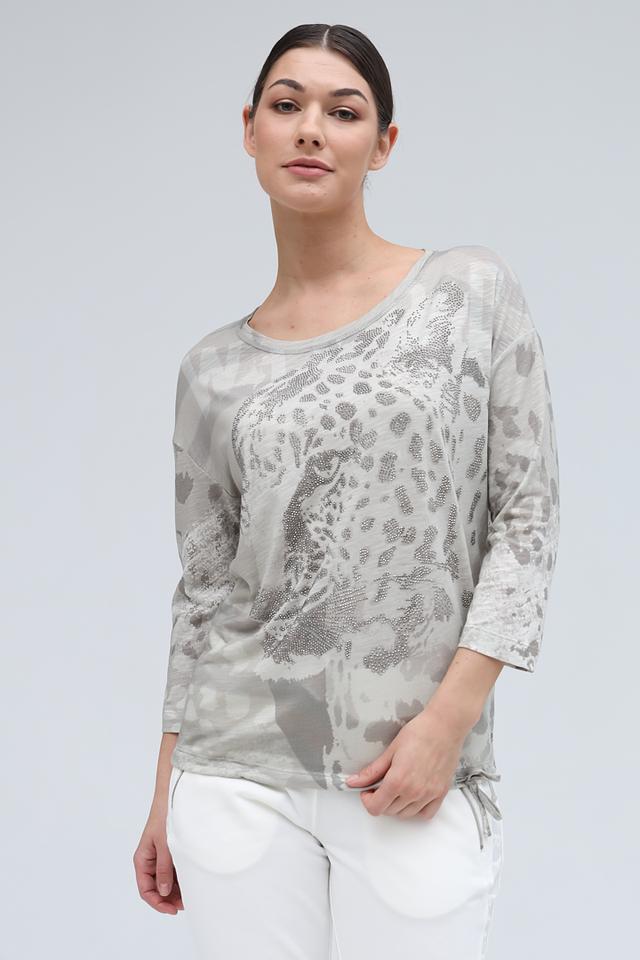 Женский лонгслив Monari серого цвета с эффектным принтом в виде леопардовой морды, украшенной стразами. Изготовлен из мягкого и приятного к телу сочетания хлопка и модала, обеспечивающего комфорт в носке. Состав: хлопок 50%, модал 50%