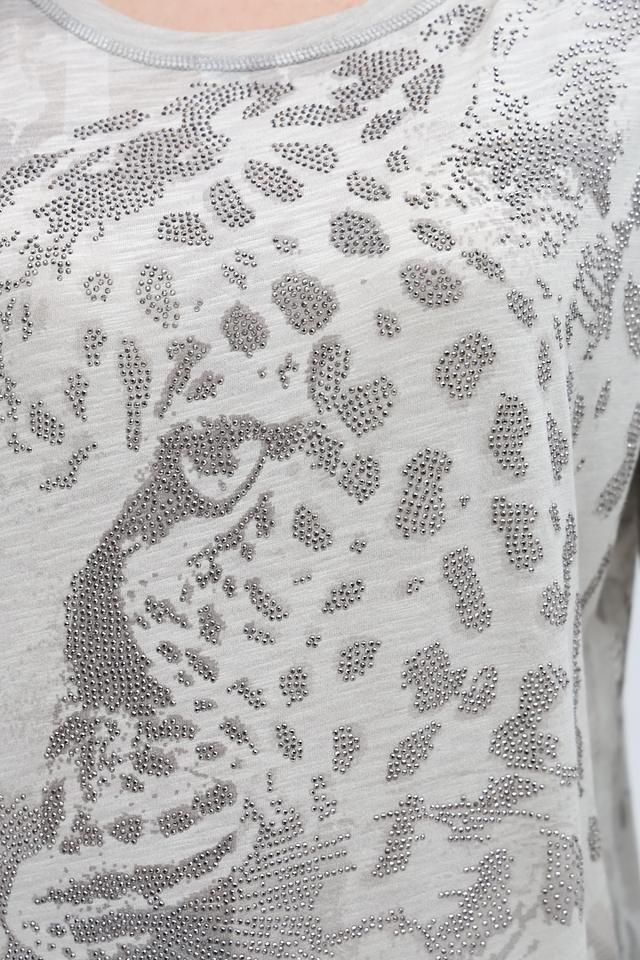 Лонгслив имеет свободный крой, который не сковывает движений и позволяет создать расслабленный образ. Основной цвет изделия – серый, а центральным элементом дизайна является крупный принт в виде леопардовой морды, выполненный с использованием множества мелких страз, что придает изделию изысканность и блеск.