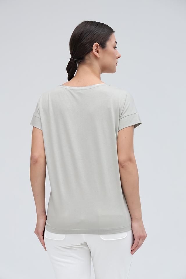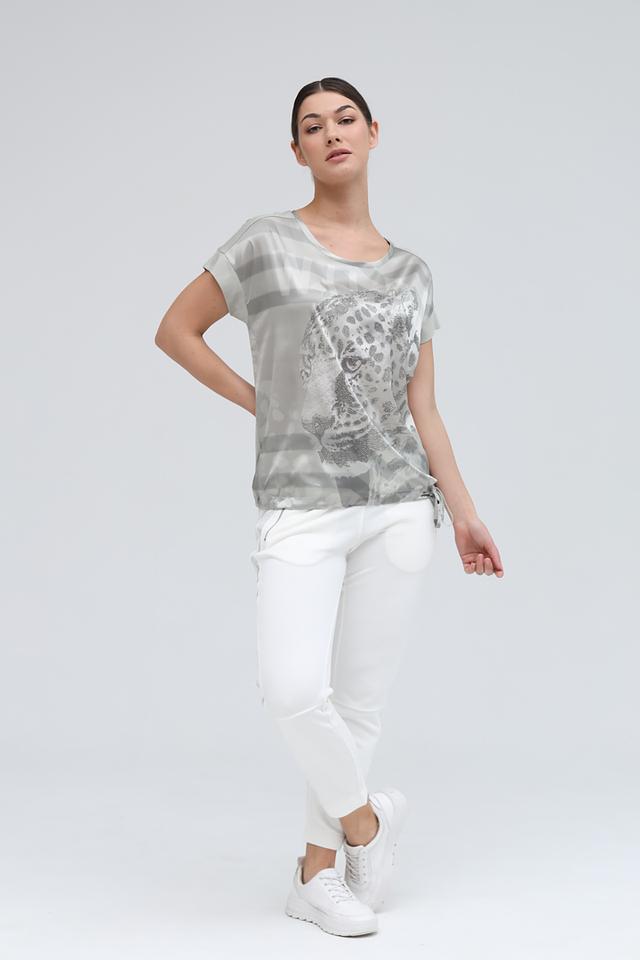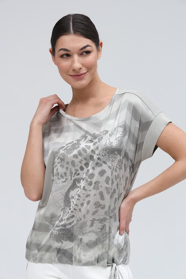 Стильная блуза Monari серого цвета с оригинальным принтом в виде изображения леопарда, украшенная мерцающими стразами. Модель с короткими рукавами и округлым вырезом горловины станет отличным дополнением к вашему образу. Состав: хлопок 50%, модал 50%