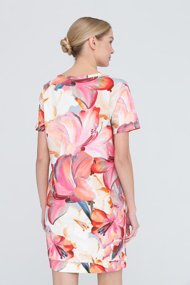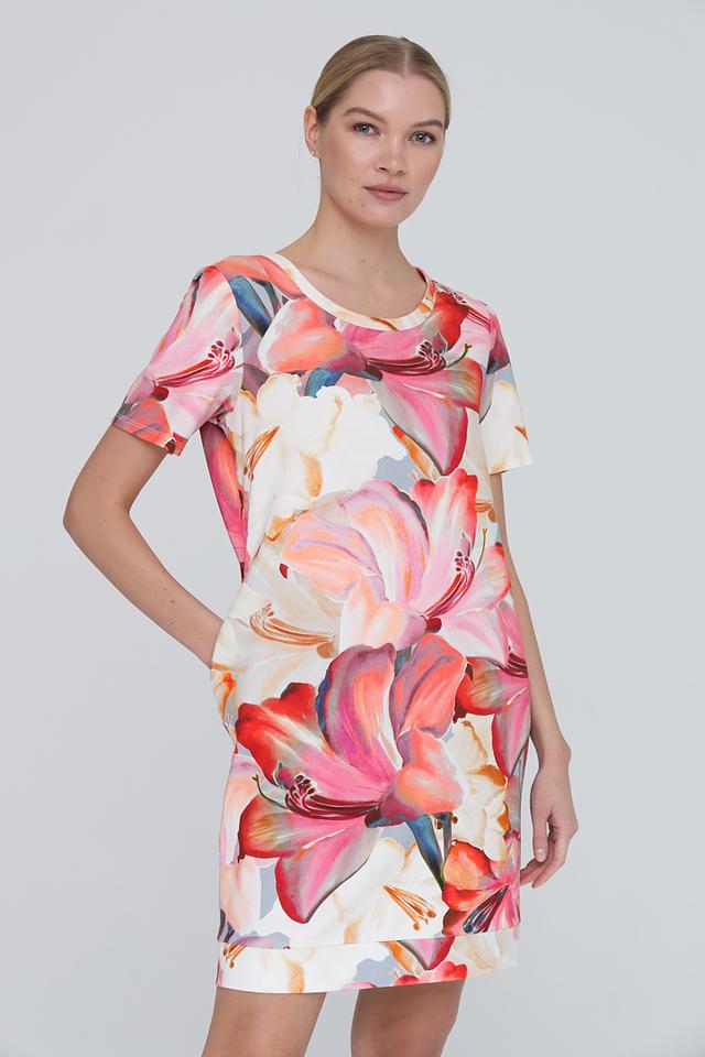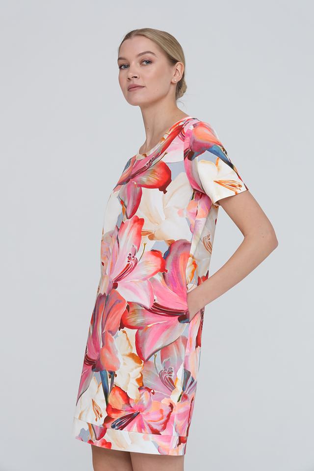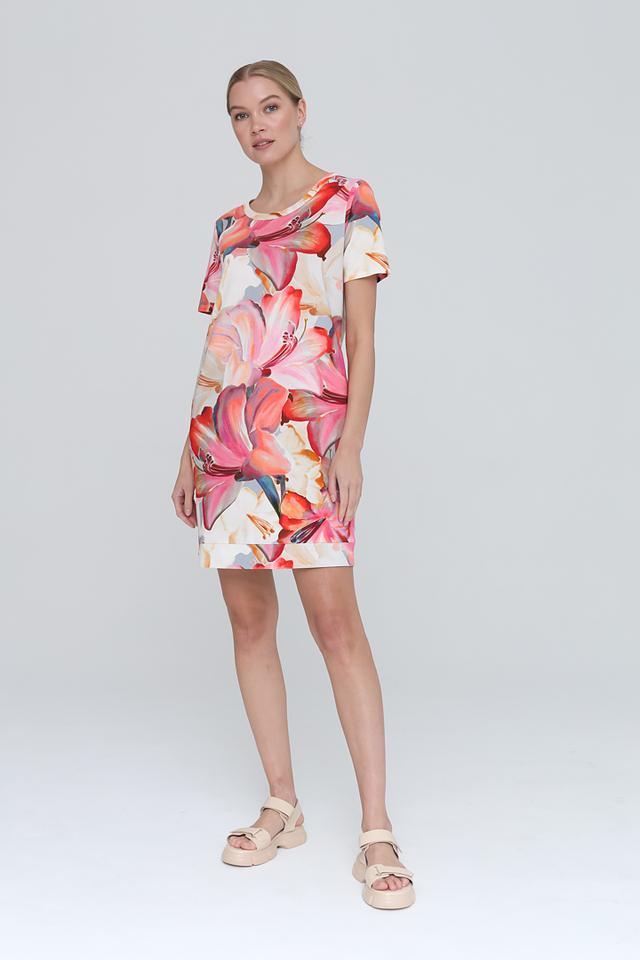 Это короткое платье от Monari выполнено из мягкого хлопка с добавлением эластана, что обеспечивает комфортную посадку и свободу движений. Преобладающий цвет – белый, но главным акцентом является яркий и красочный цветочный принт, состоящий из крупных изображений лилий в оттенках розового, оранжевого и красного.