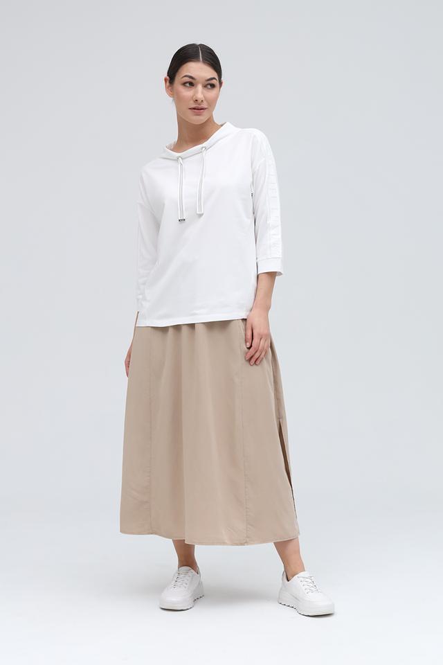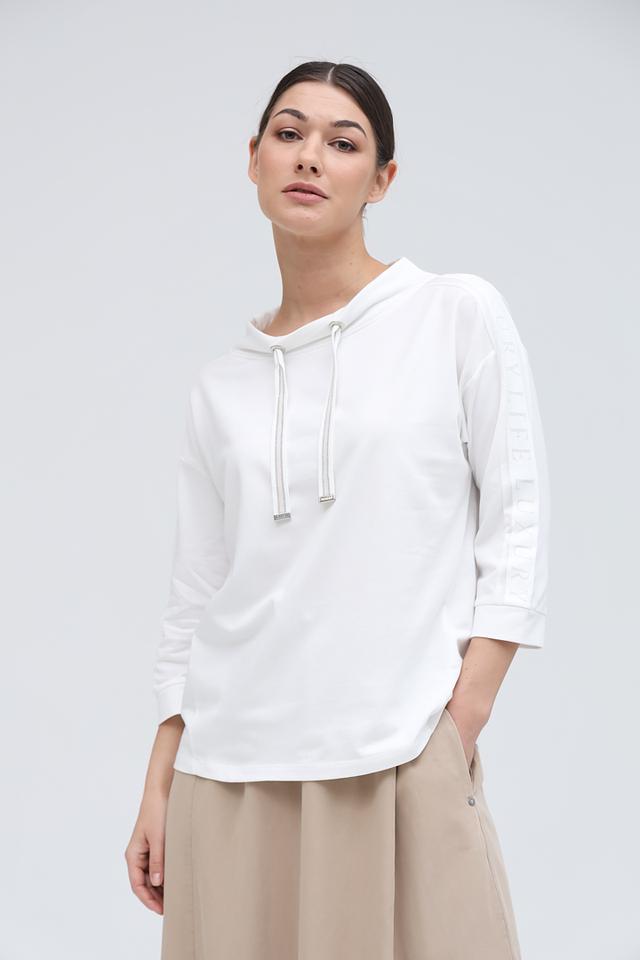 Белый джемпер от Monari с капюшоном и шнурками – стильная и комфортная модель на каждый день. Удлиненный рукав 3/4 и лаконичный дизайн делают этот джемпер универсальным элементом гардероба. Состав: хлопок 50%, модал 50%