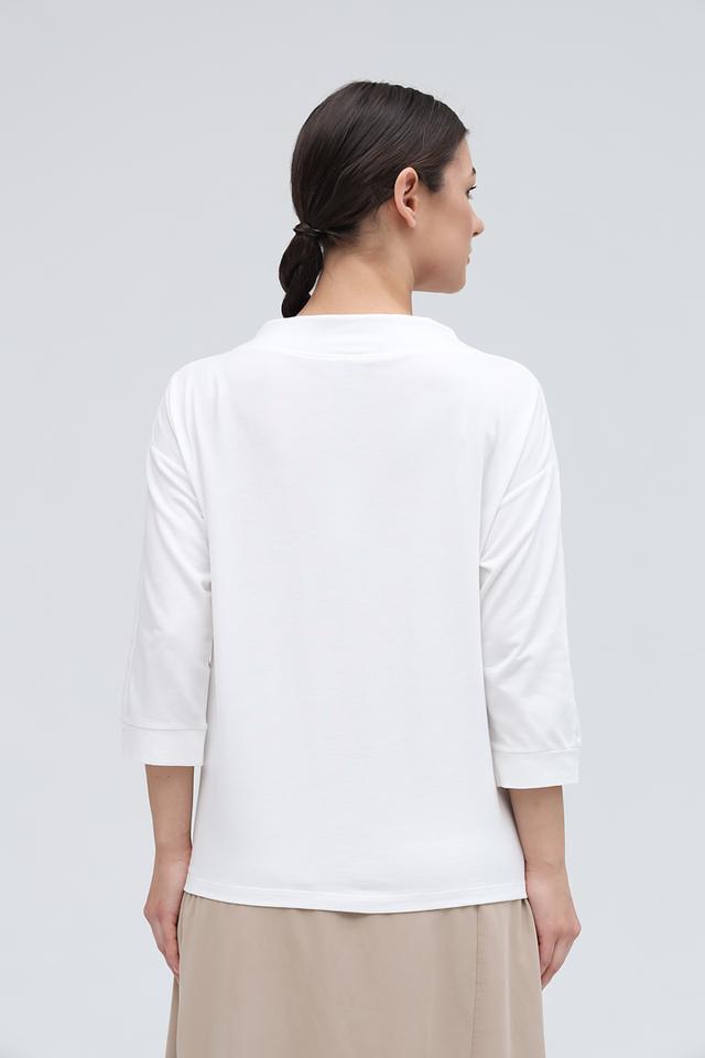 Рукава джемпера – три четверти, что делает его идеальным для теплой погоды или для создания многослойных образов. На рукавах присутствует надпись, добавляющая изюминку в дизайн. Джемпер выполнен из высококачественного хлопка и модала, что обеспечивает мягкость и приятные ощущения на коже.