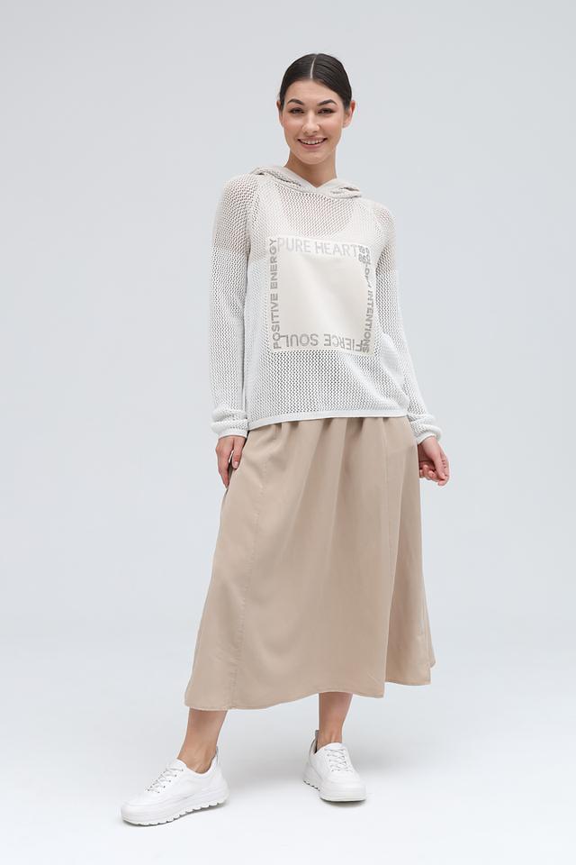 Модель дополнена капюшоном, что делает ее более практичной и универсальной. Передняя часть пуловера украшена ярким принтом с надписями, выполненными в сером цвете. Принт добавляет образу оригинальности и индивидуальности.
