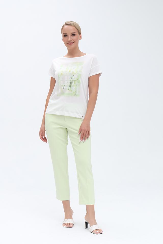 Особенностью данной модели является стильный принт с абстрактными элементами в нежных зеленых тонах, который придает ей индивидуальность. Футболка имеет прямой крой, короткие рукава и круглый вырез горловины.