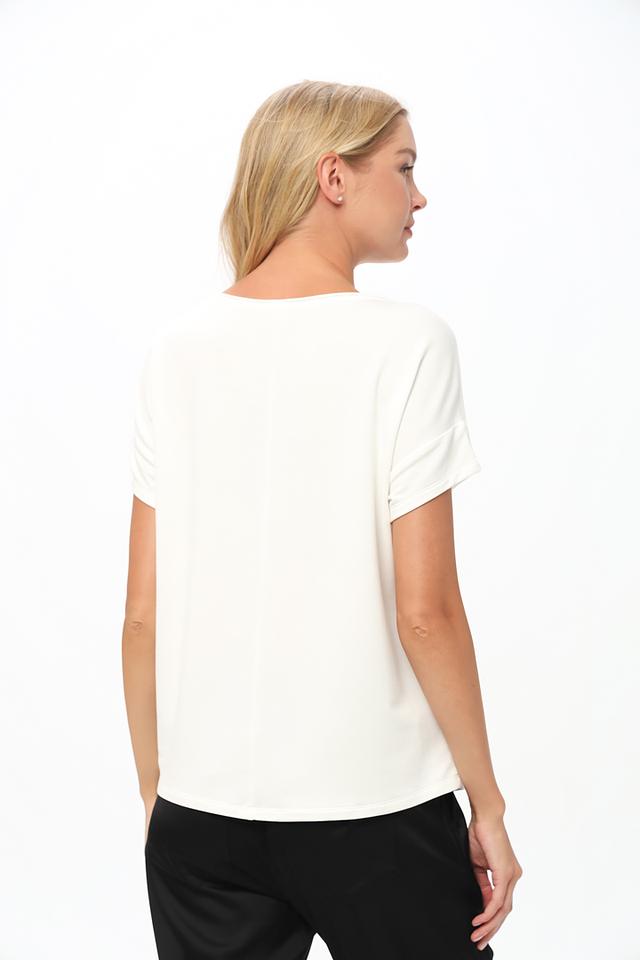 Модель имеет свободный крой, короткие рукава и круглый вырез горловины. Футболка изготовлена из высококачественного трикотажа, состоящего из 45% вискозы, 45% модала и 10% эластана. Благодаря такому составу, футболка приятна к телу, хорошо держит форму и не мнется.