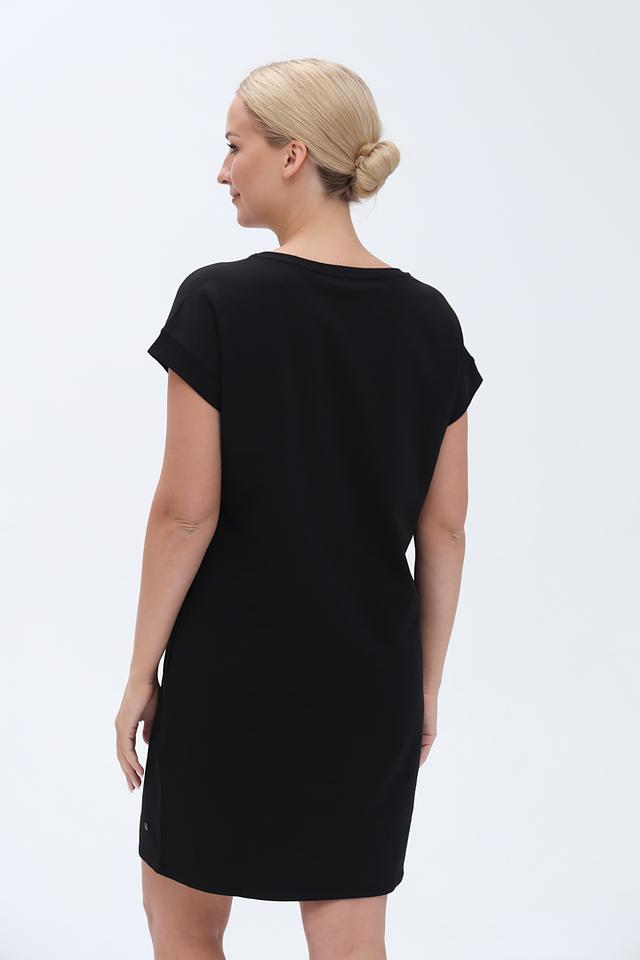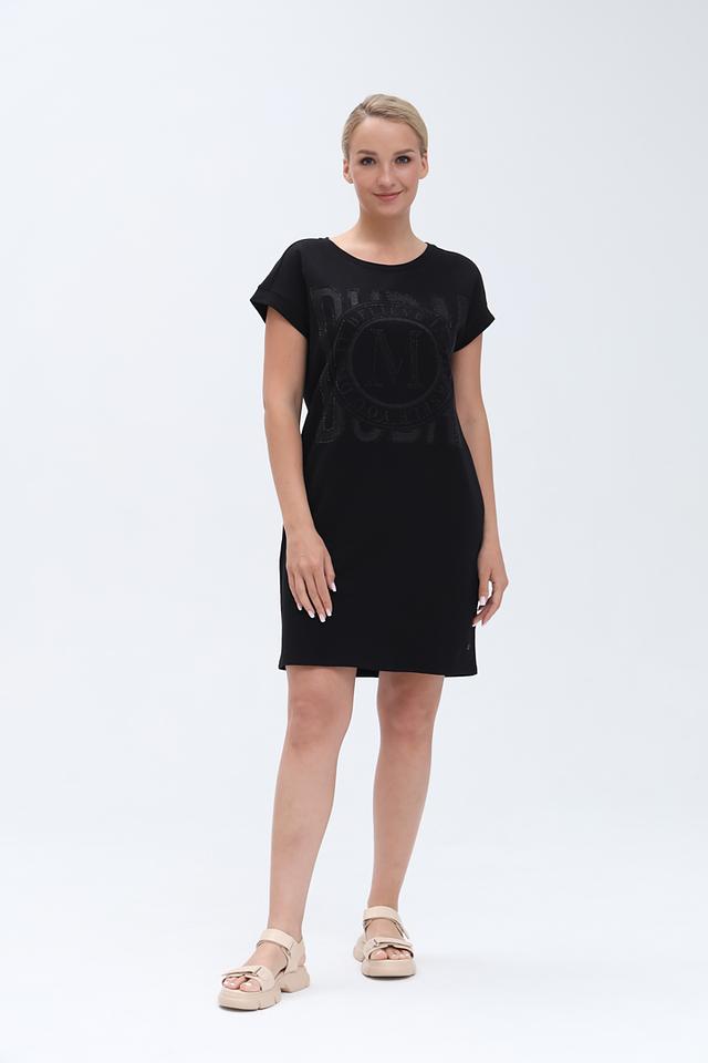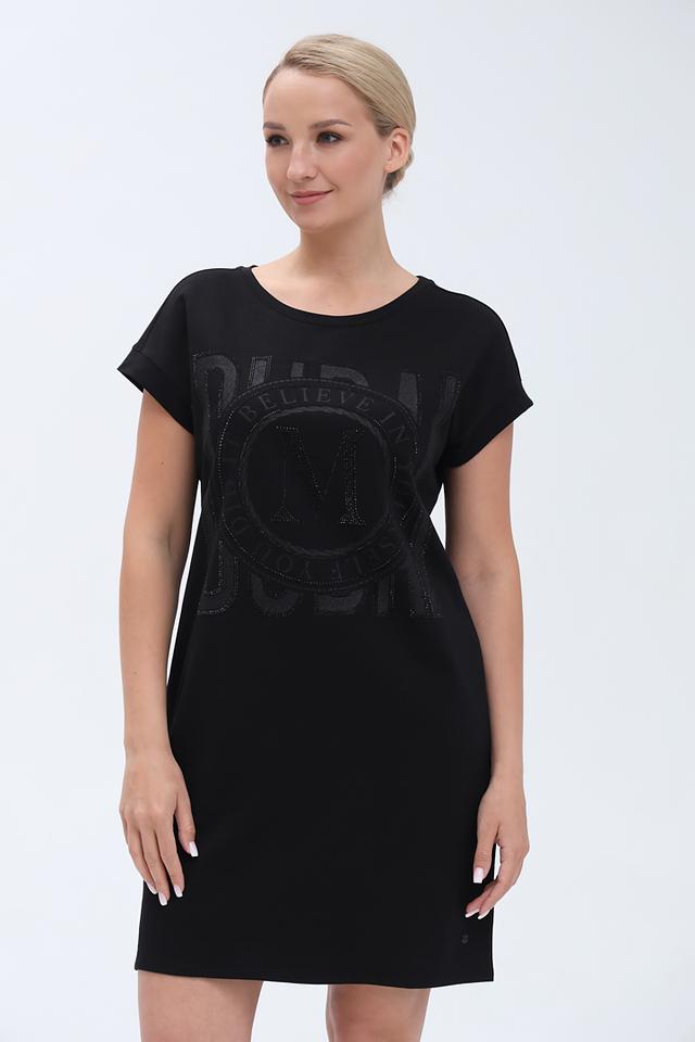 Чёрное платье от Monari – это стильное и комфортное решение для повседневного гардероба. Модель свободного кроя с короткими рукавами и оригинальным принтом в виде логотипа бренда. Состав: хлопок 82%, модал 13%, эластан 5%