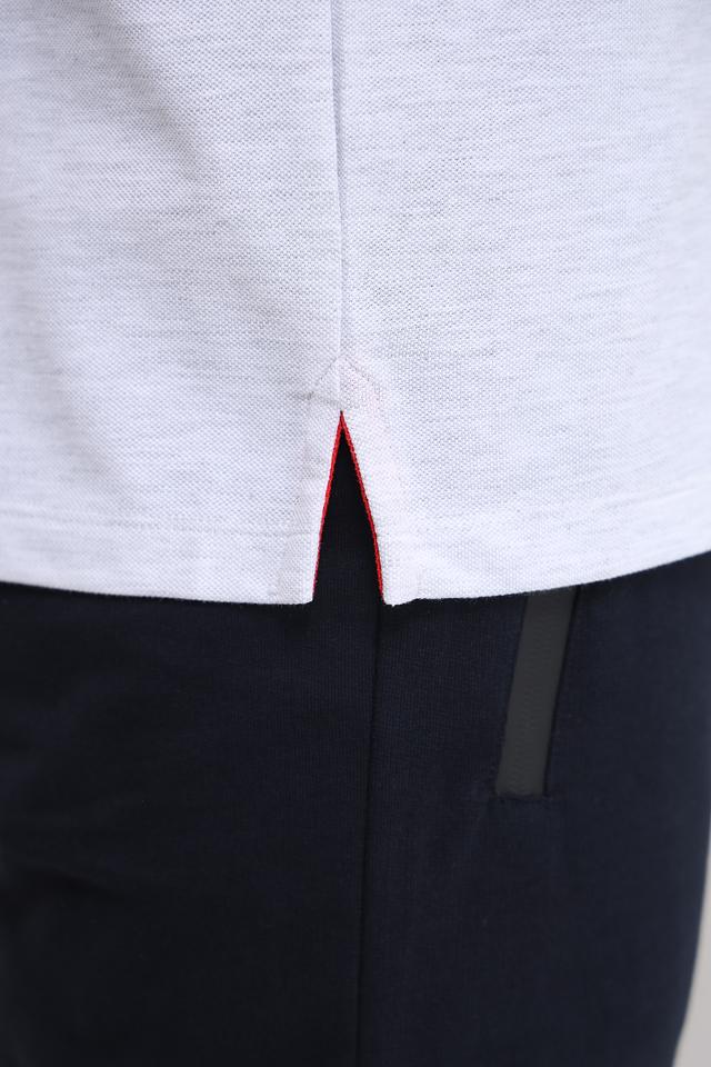 Особенностью данного поло является контрастная отделка на воротнике и манжетах рукавов в красном цвете, что придает образу динамичности и стиля. Застежка выполнена на три пуговицы в тон изделия. На груди расположена небольшая эмблема бренда.