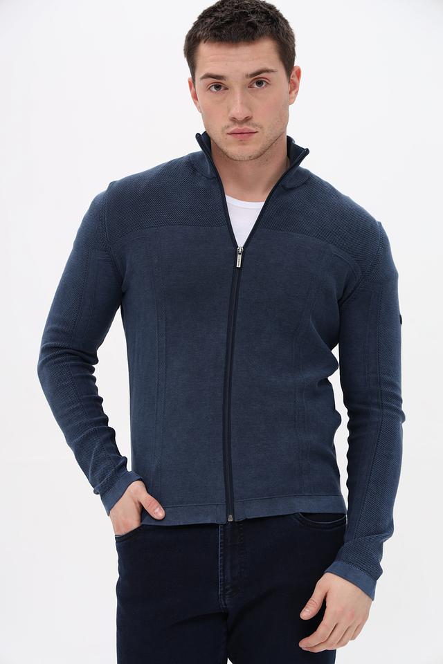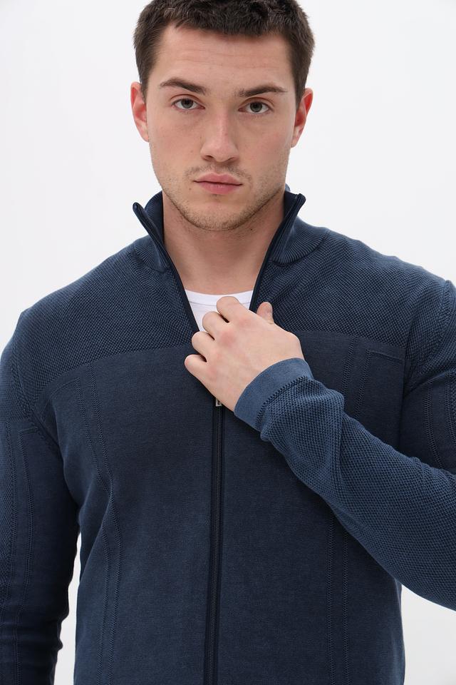 Кардиган имеет удобную застёжку на молнии, воротник-стойку и длинные рукава. Дизайн модели сочетает в себе элементы классики и современности, что делает её универсальной для различных стилей одежды.