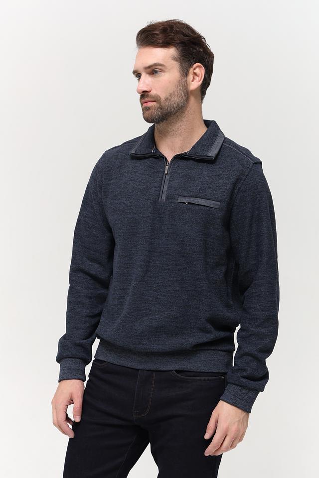 Поло имеет классический крой и тёмно-синий цвет с меланжированным эффектом. Короткая молния на горловине добавляет модели функциональности и позволяет регулировать степень открытости. На груди расположен накладной карман, который не только служит декоративным элементом, но и предоставляет дополнительное место для хранения мелких предметов.