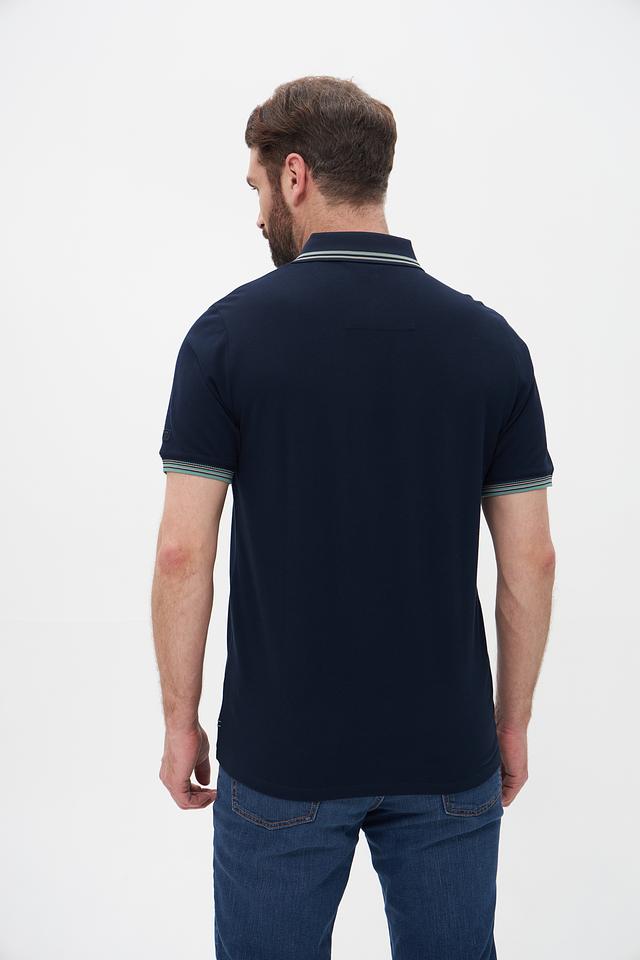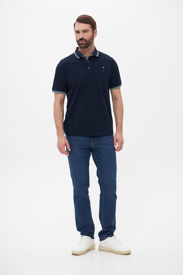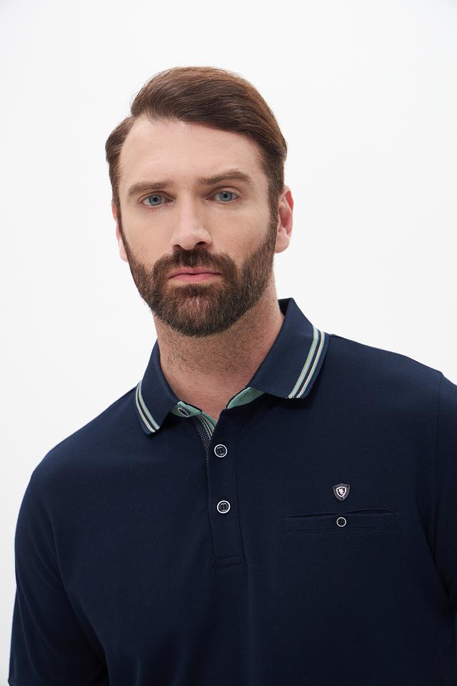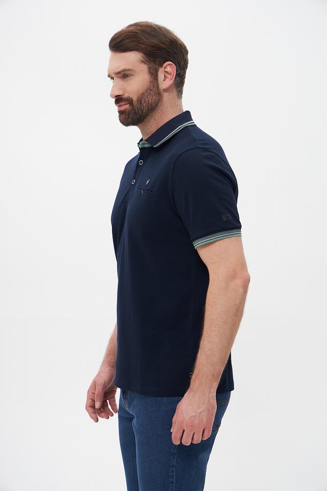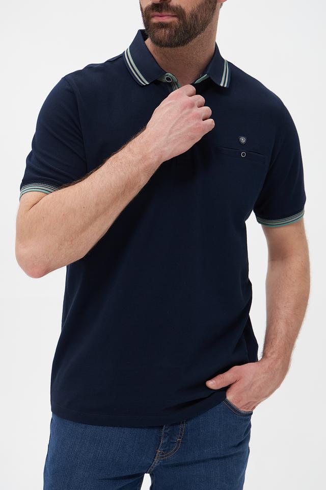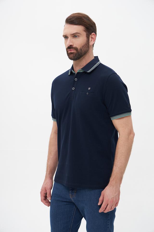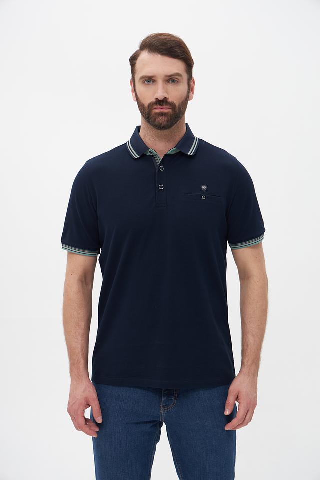 Мужское поло Monte Carlo темно-синего цвета с коротким рукавом и нагружным карманом. Классический крой и отделка воротника и рукавов зелёной полосой делают эту модель стильной и универсальной. Состав: хлопок 100%