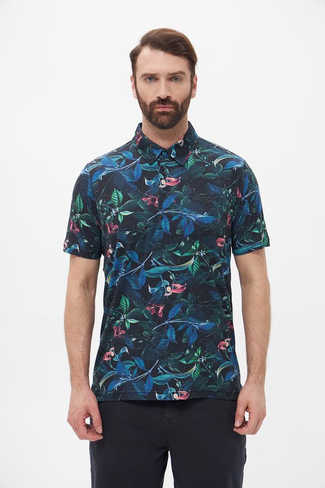 Это мужское поло от Monte Carlo выполнено в тёмно-синем цвете и украшено эффектным тропическим принтом, включающим в себя различные оттенки зелёного, голубого и розового. Модель имеет классический крой с короткими рукавами и воротником-поло.