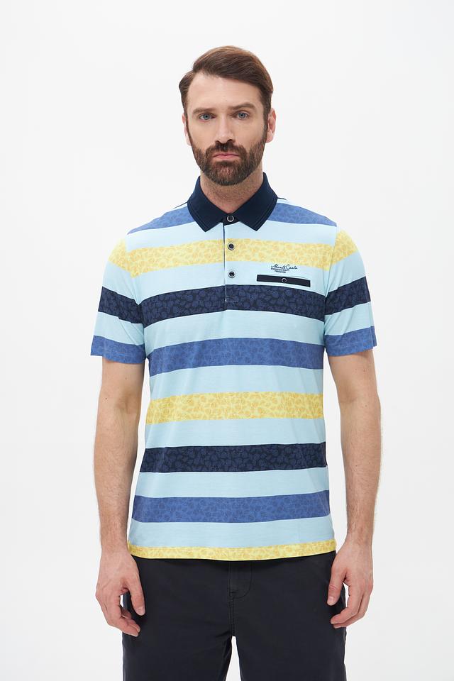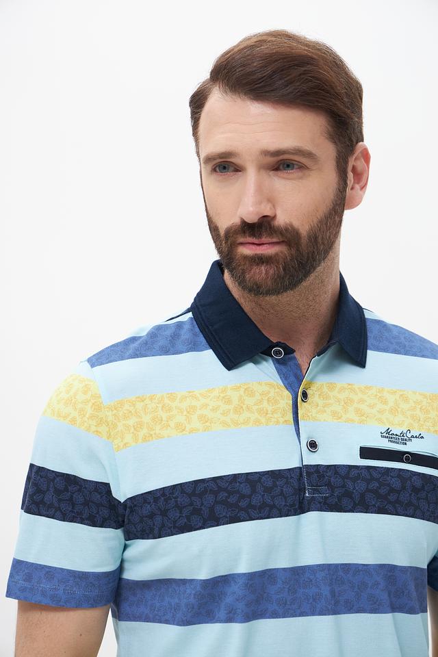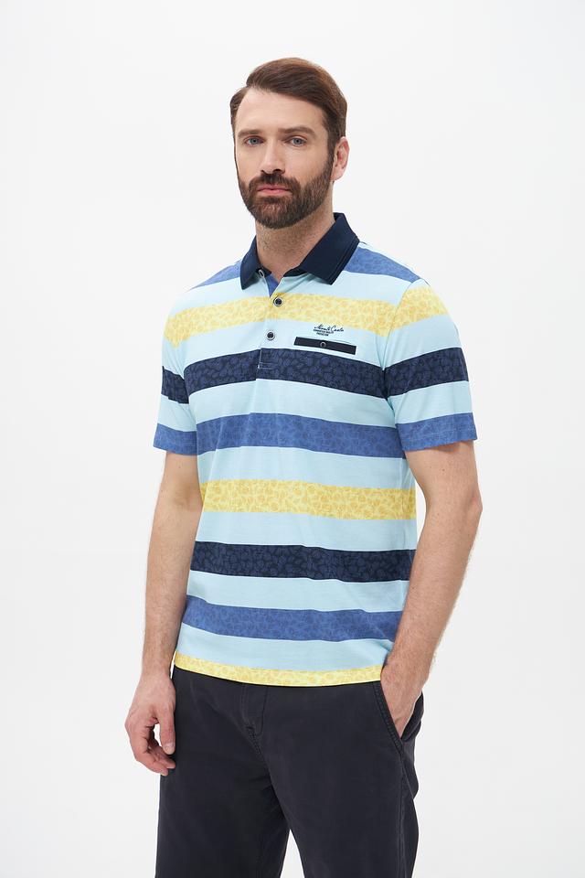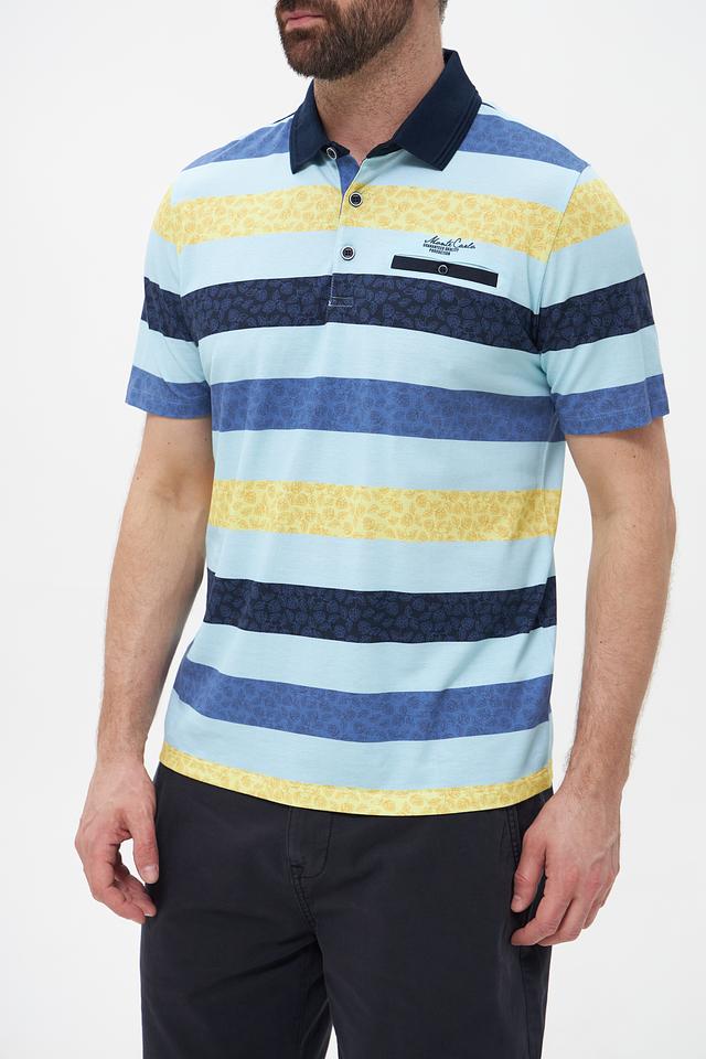 Мужское поло Monte Carlo голубого цвета с ярким полосатым принтом. Изготовлено из 100% хлопка, обеспечивающего комфорт и воздухопроницаемость. Отличный выбор для повседневного образа. Состав: хлопок 100%