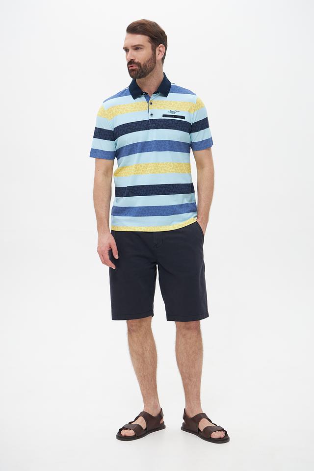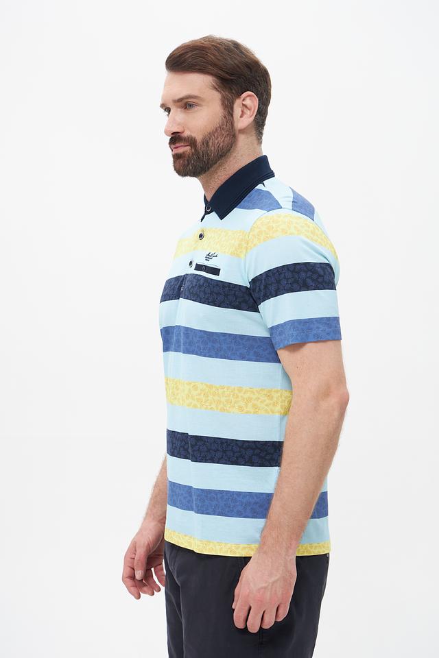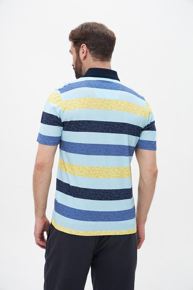 Поло выполнено в яркой цветовой гамме с оригинальным полосатым принтом, сочетающим в себе голубые, жёлтые и синие оттенки. Воротник и планка застёжки выполнены в тёмно-синем цвете, что добавляет контрастности и стиля.