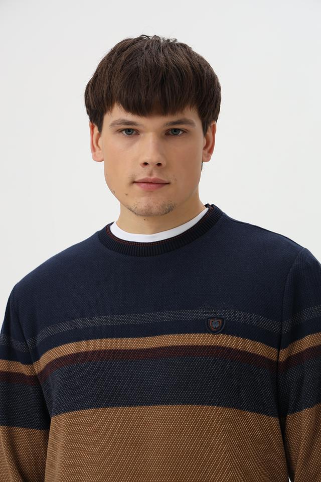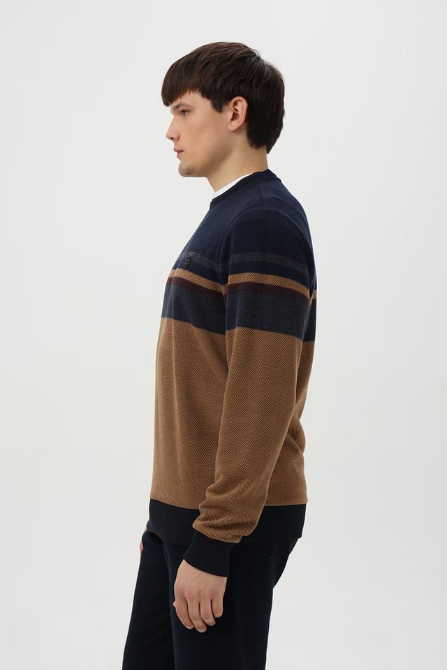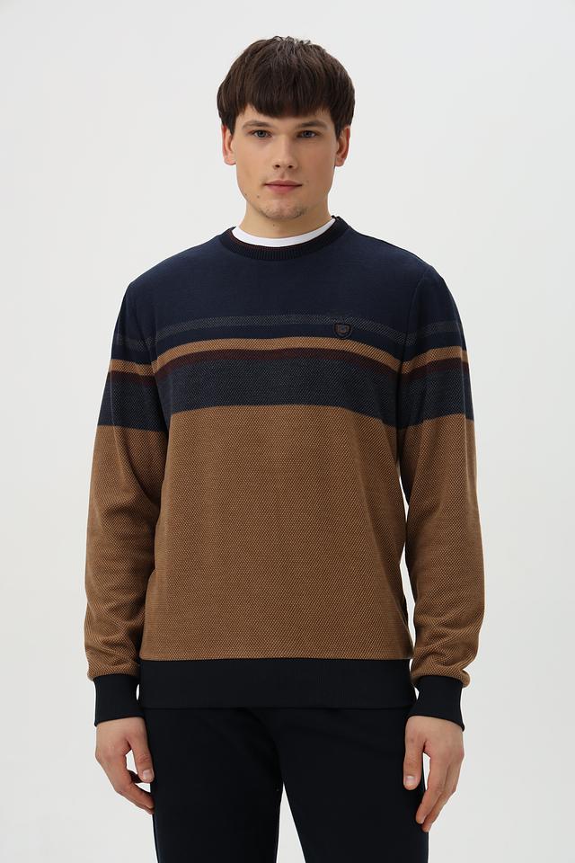 Мужской джемпер Monte Carlo коричневого и тёмно-синего цвета с полосатым узором. Изготовлен из хлопка с добавлением полиэстера для комфорта и долговечности. Состав: хлопок 65%, полиэстер 35%