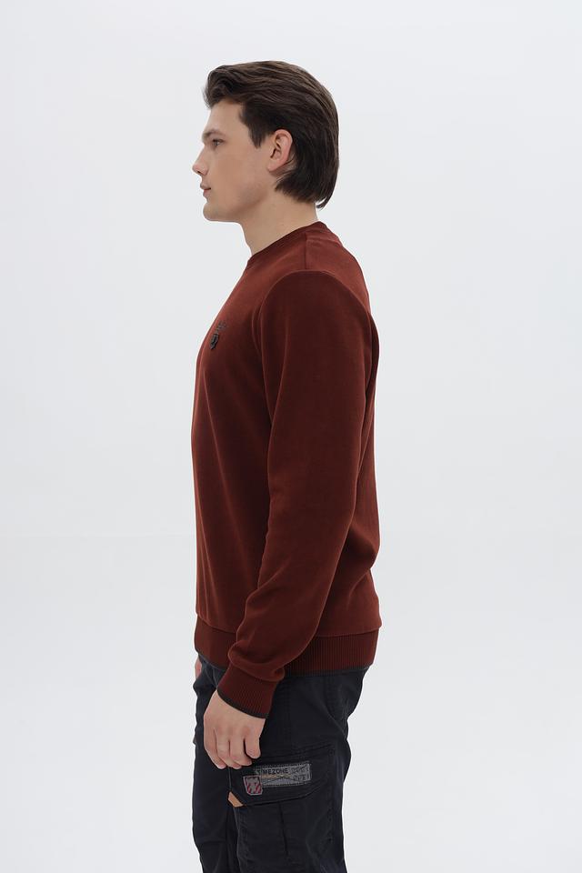 Джемпер имеет классический крой с круглым вырезом горловины и длинными рукавами. Манжеты и нижний край выполнены из плотной резинки, обеспечивающей комфортную посадку по фигуре. На груди расположен небольшой логотип бренда, выполненный в тон.