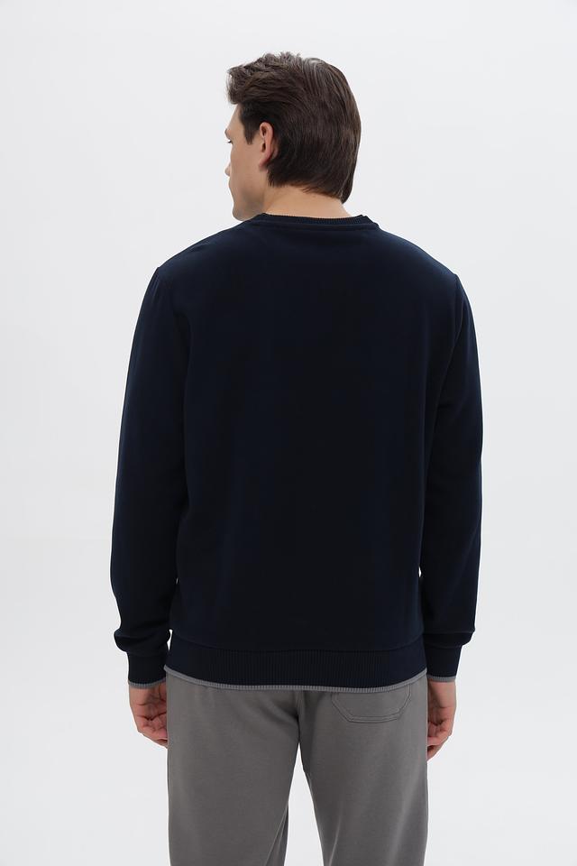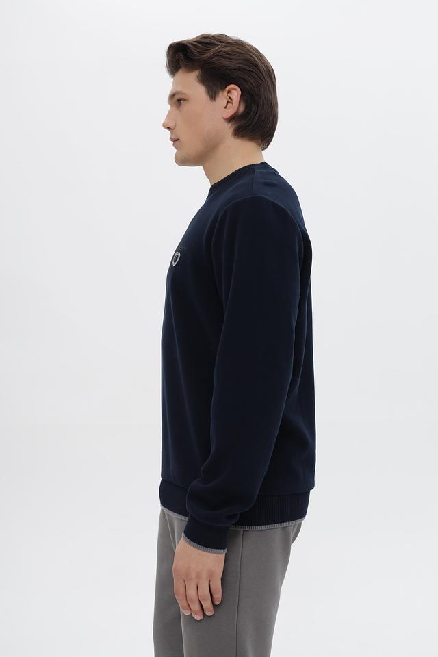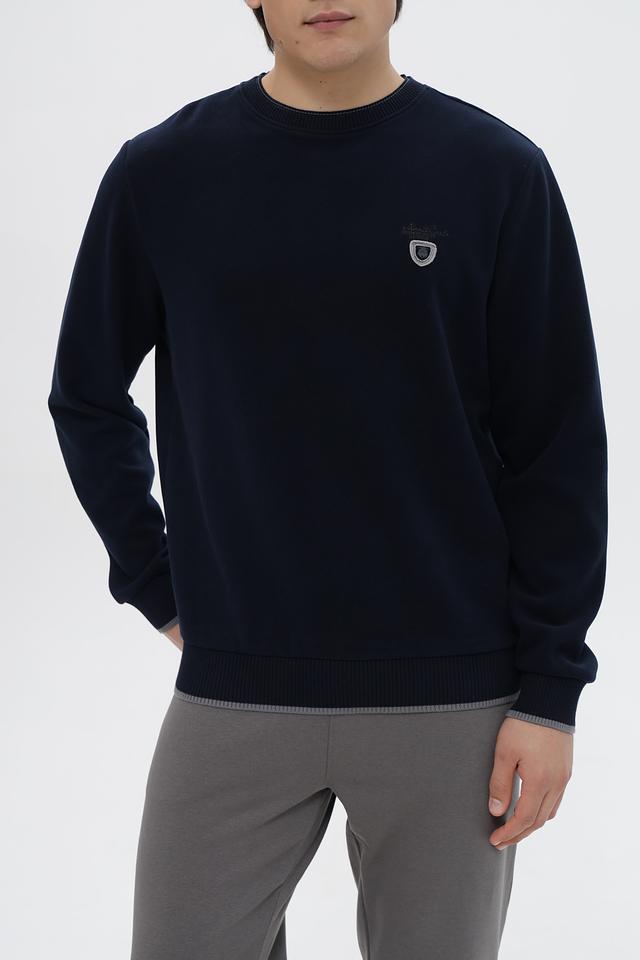 Свитер имеет круглый вырез горловины и длинные рукава. На груди слева расположена небольшая эмблема бренда, выполненная в сером цвете. Манжеты и нижний край джемпера имеют резинку с контрастной серой полосой, что добавляет модели стильный акцент.