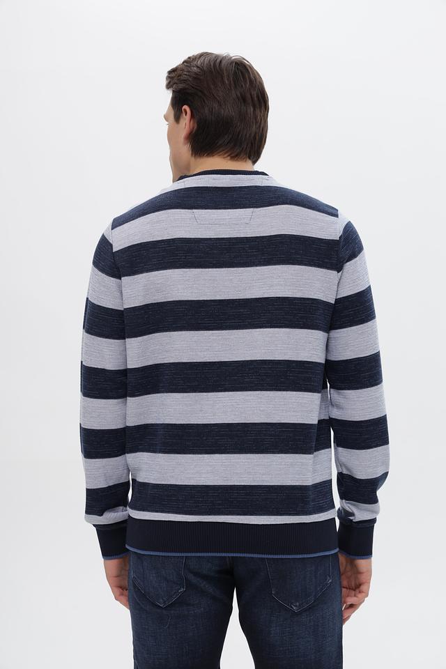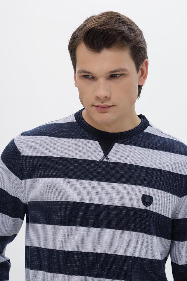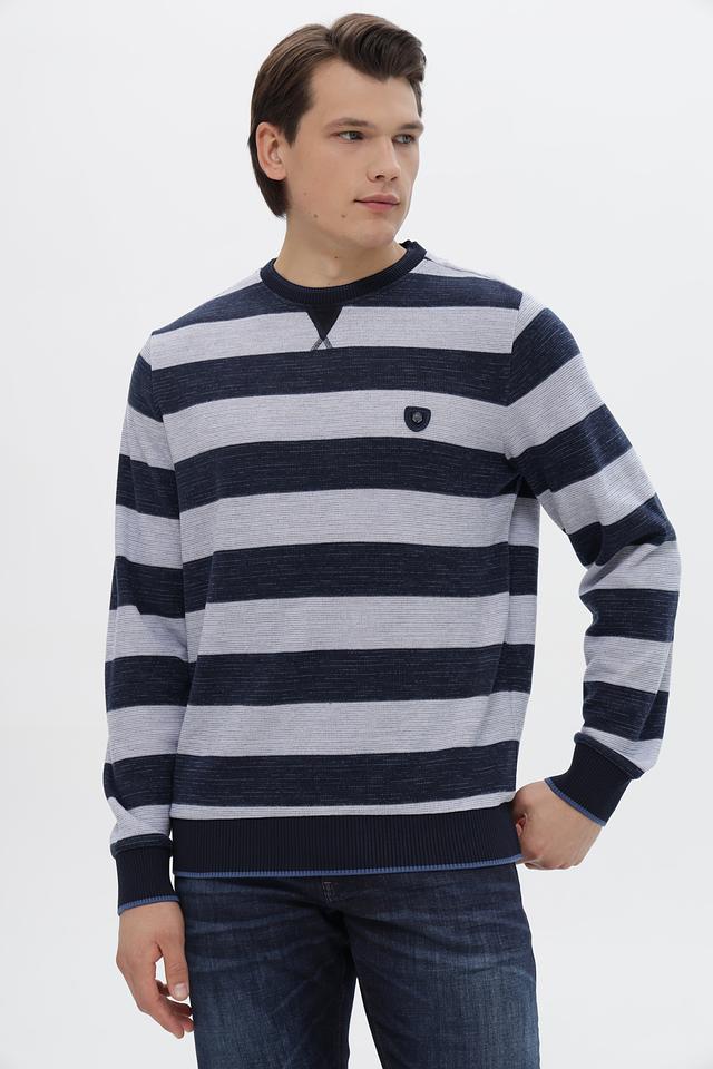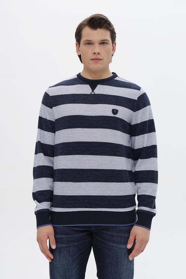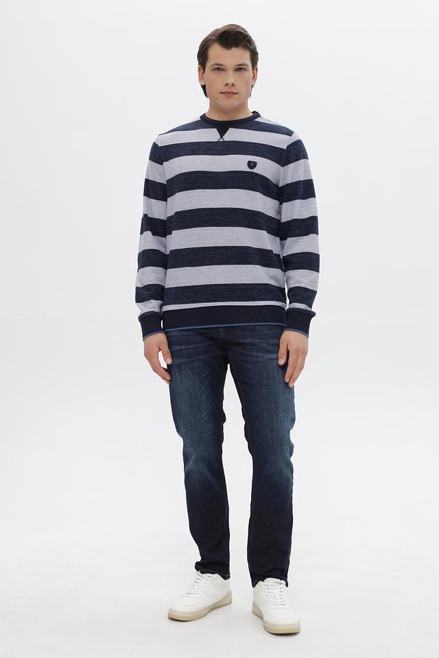 Основной цвет джемпера – сочетание темно-синего и светло-серого, выполненное в виде горизонтальных полос. Такая расцветка делает изделие универсальным и легко сочетаемым с различными элементами гардероба. На груди расположен небольшой логотип бренда.
