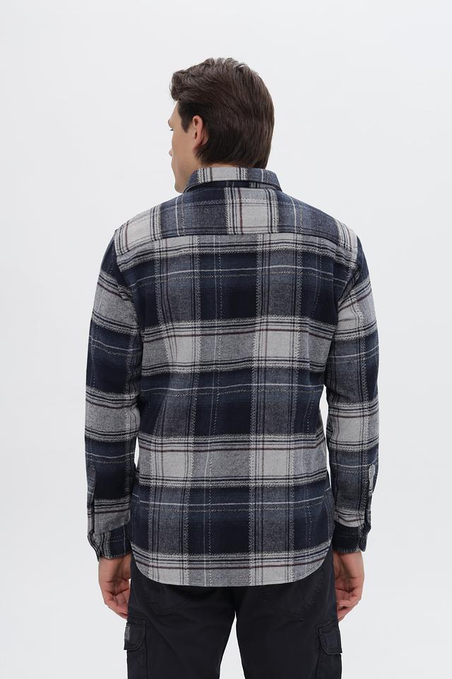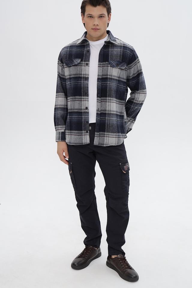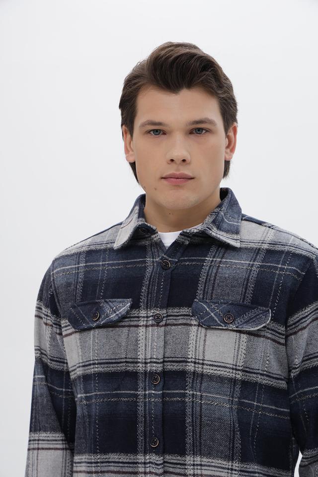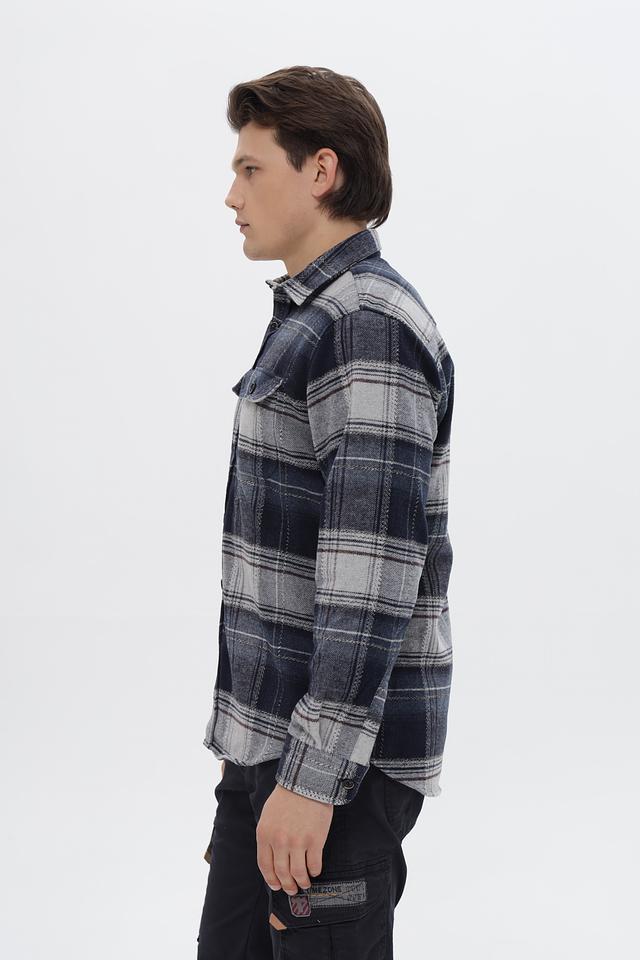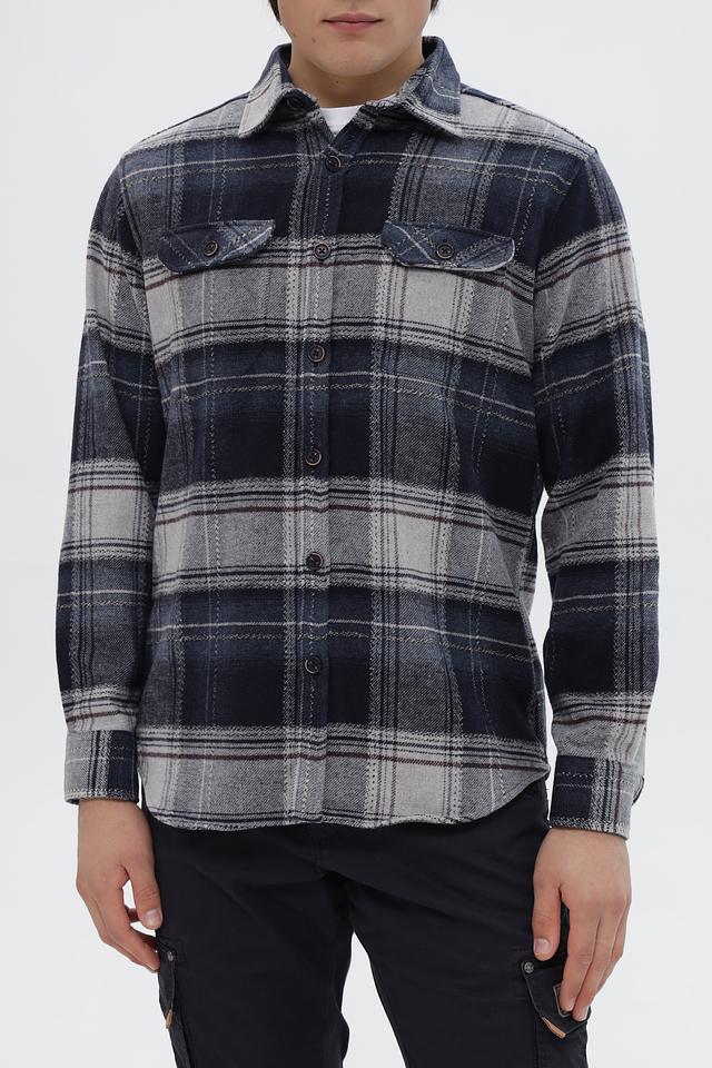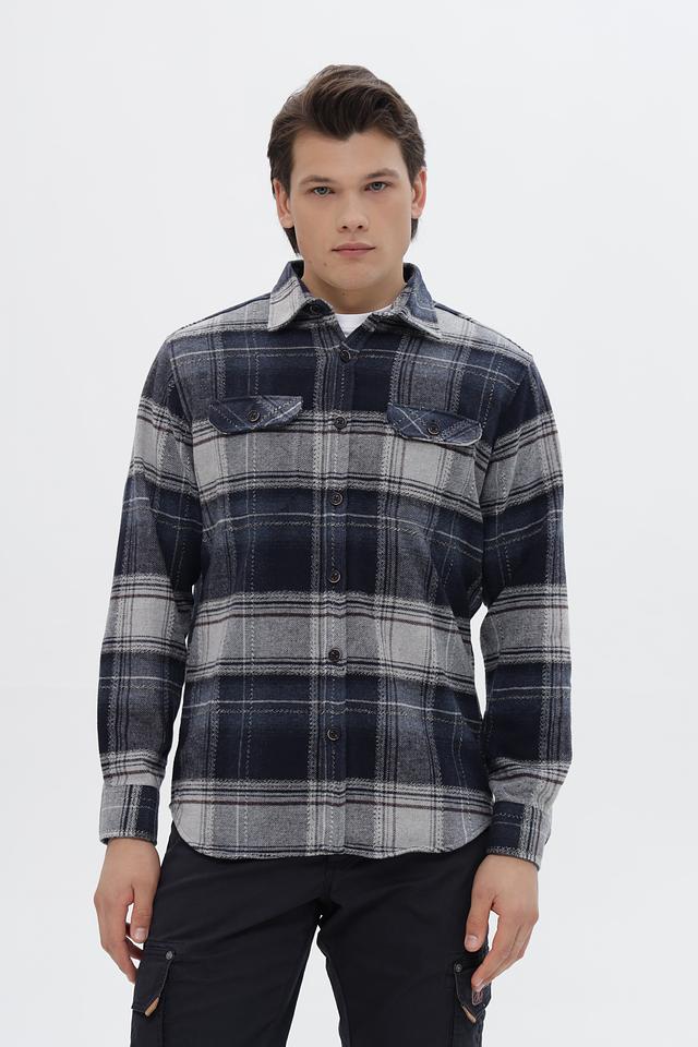 Рубашка имеет классический крой с длинными рукавами и традиционным воротником. Застежка на пуговицы обеспечивает надежную фиксацию. Дизайн рубашки выполнен в клетку, сочетающую оттенки синего и серого, что придает ей стильный и универсальный вид.