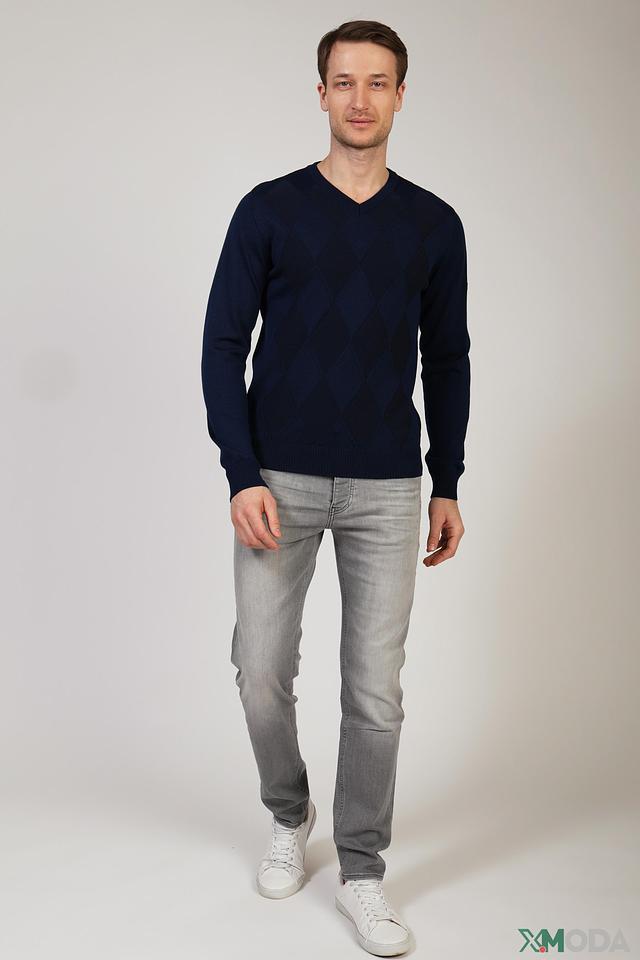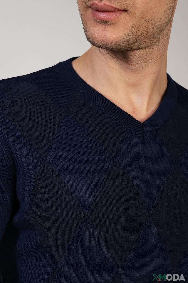 Основной акцент дизайна – ромбовидный узор, выполненный в более темном оттенке синего, что придает изделию текстурность и визуальный интерес. Джемпер имеет прямую посадку, не сковывающую движений.