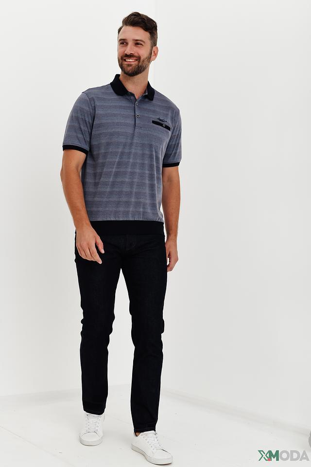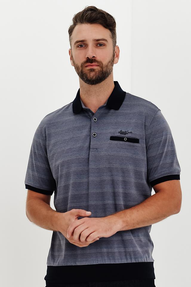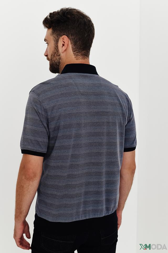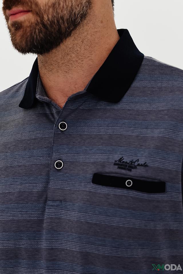 Основной цвет поло – серый, с выразительным полосатым рисунком. Воротник и планка застежки выполнены в тёмно-синем цвете, что добавляет контрастности и акцентирует внимание. На груди расположена небольшая планка с вышитым логотипом бренда Monte Carlo.