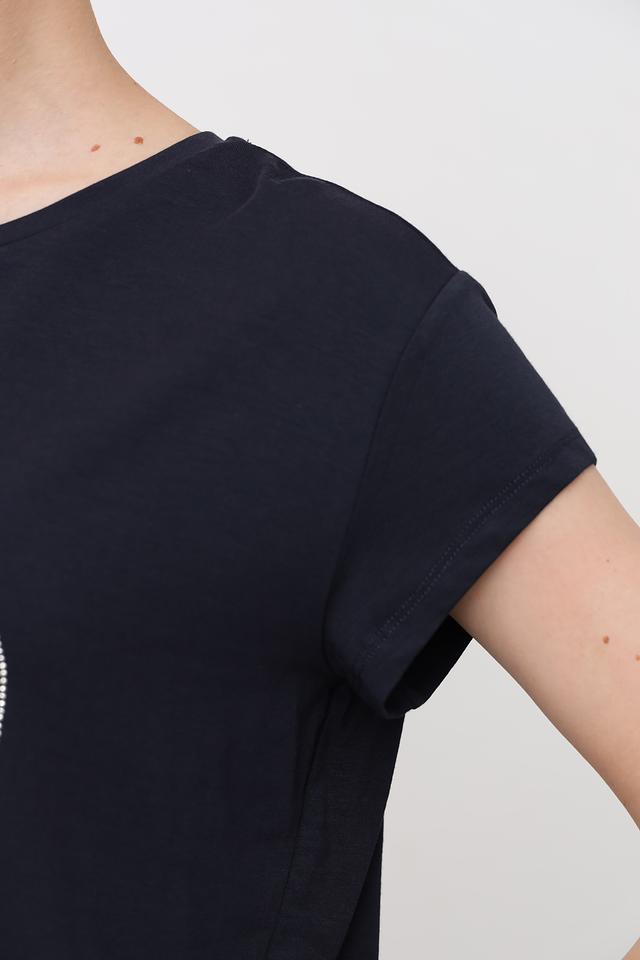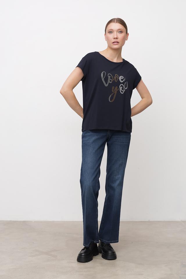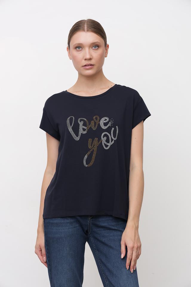 Женская футболка More and More тёмно-синего цвета украшена надписью "Love You", выполненной в виде страз. Модель имеет свободный крой и короткие рукава, что обеспечивает комфорт в повседневной носке. Состав: хлопок 48%, модал 48%, эластан 4%