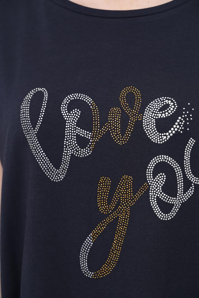 Особенностью данной модели является декоративная надпись "Love You", выполненная с использованием страз серебристого и золотистого цвета. Этот элемент придает футболке оригинальность и привлекательность.