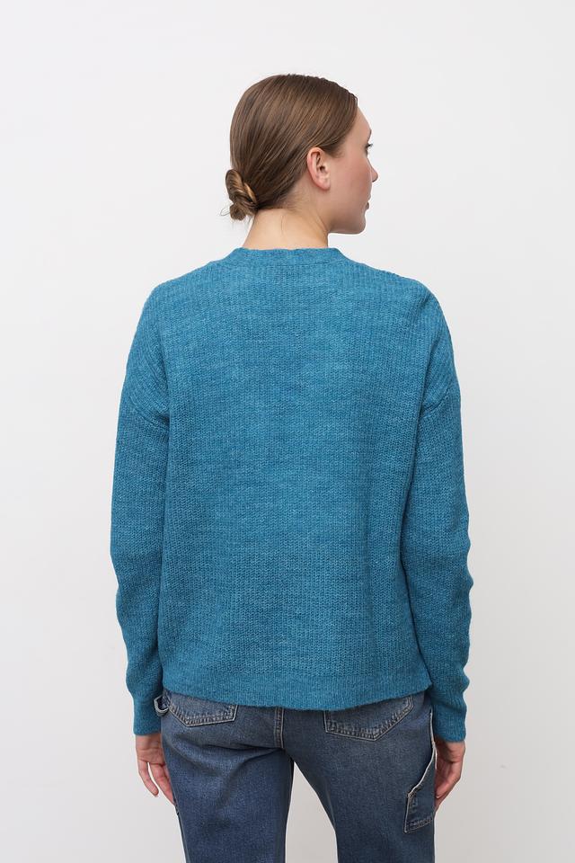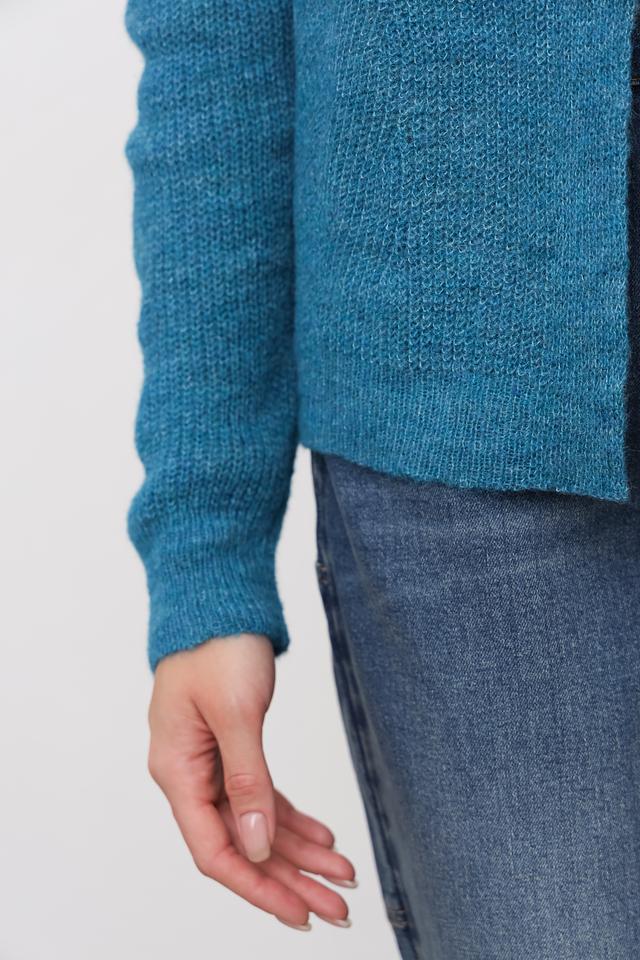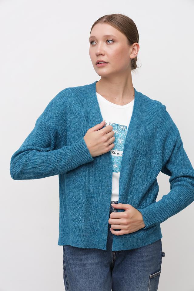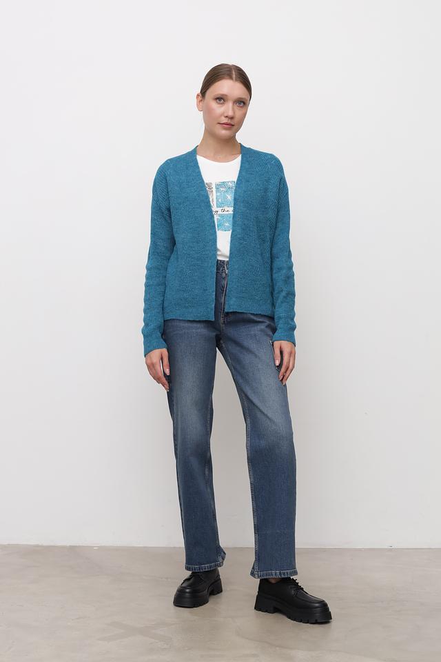Модель имеет открытый крой, длинные рукава и классический силуэт. Бирюзовый цвет кардигана освежает образ и легко сочетается с другими элементами одежды.