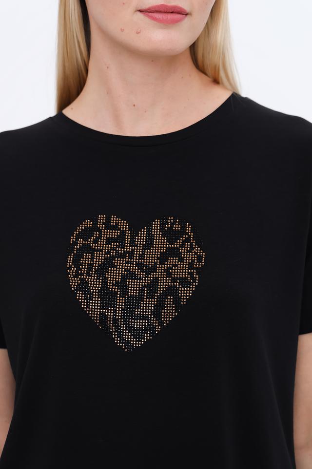 Эта стильная футболка от бренда More and More станет отличным дополнением к вашему гардеробу. Футболка выполнена в классическом чёрном цвете и украшена оригинальным принтом в форме сердца, выполненным с использованием декоративных элементов.