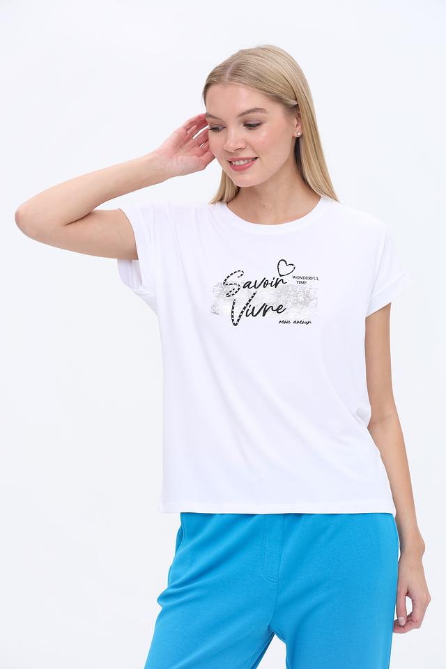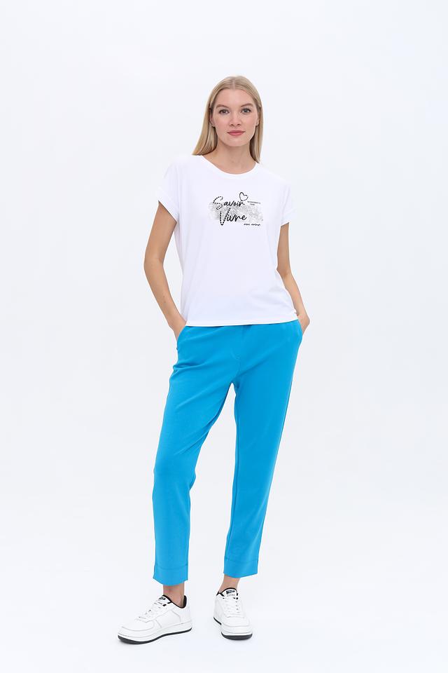 Белая футболка More and More с оригинальным принтом "Savoir Vivre" станет стильным дополнением к вашему гардеробу. Модель выполнена из мягкого и приятного к телу сочетания хлопка, модала и эластана, обеспечивая комфорт в носке. Состав: хлопок 48%, модал 48%, эластан 4%