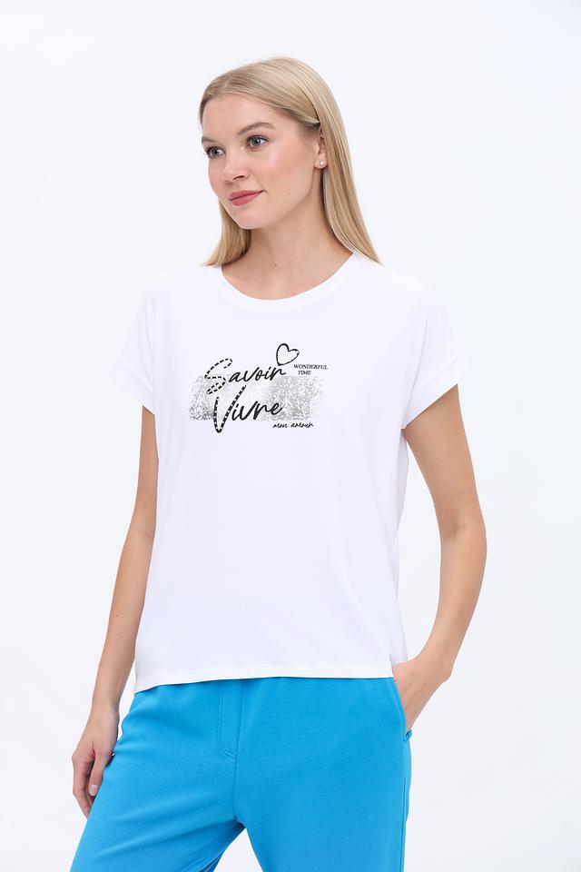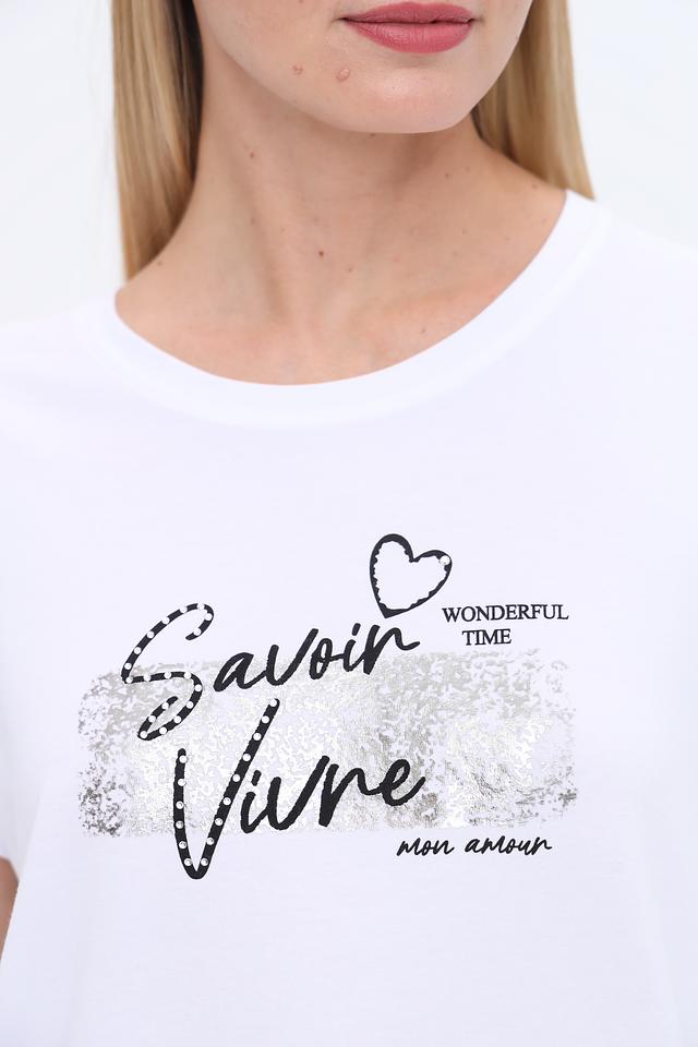 Основным акцентом футболки является яркий принт "Savoir Vivre", выполненный в сочетании черного и серебристого цветов. Принт добавляет образу оригинальности и индивидуальности.