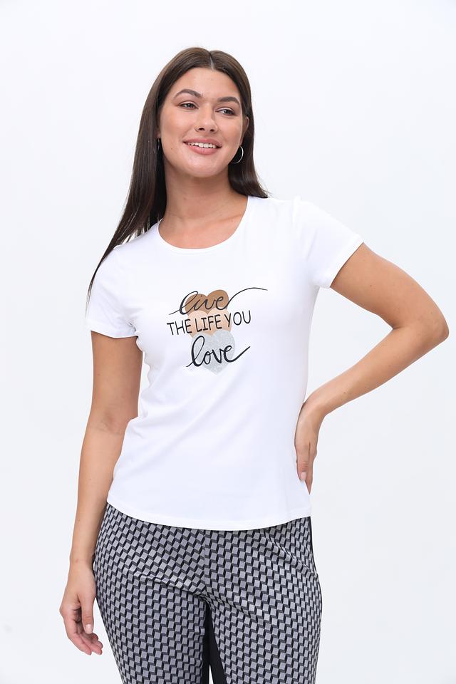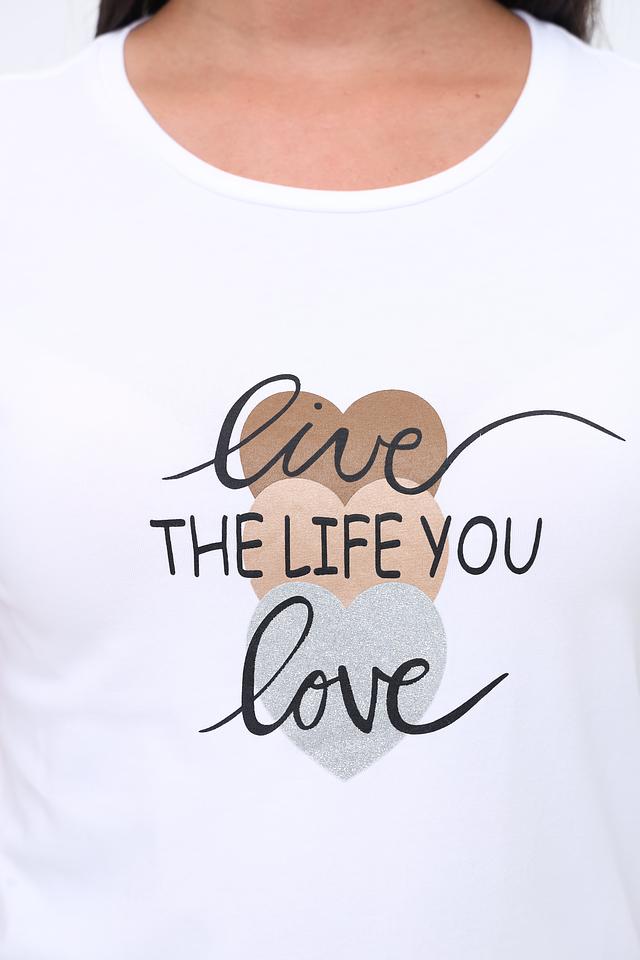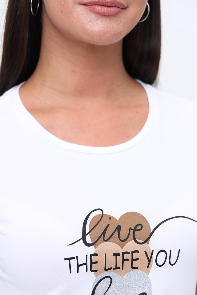 Футболка имеет классический крой с короткими рукавами и круглым вырезом горловины. Главная особенность модели – стильный принт с надписью "live THE LIFE YOU love" и изображением сердца, выполненный в чёрно-золотистой гамме.