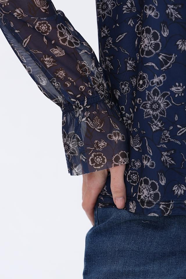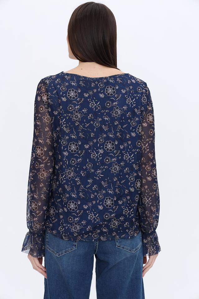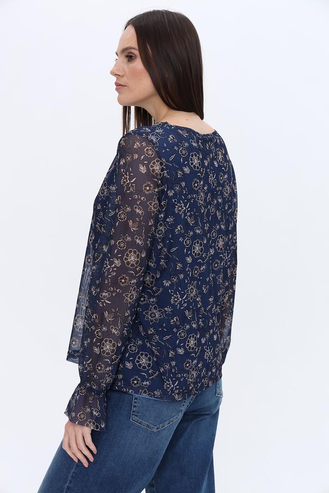 Блуза имеет длинные рукава, слегка расширенные к запястью, и округлый вырез горловины с небольшим разрезом в форме капли. Полупрозрачная ткань украшена мелким цветочным принтом в бежевых и золотистых тонах, что придает ей романтичный вид.
