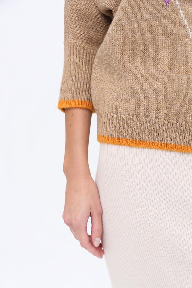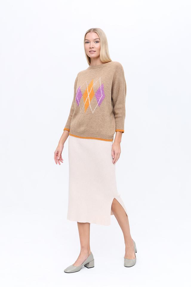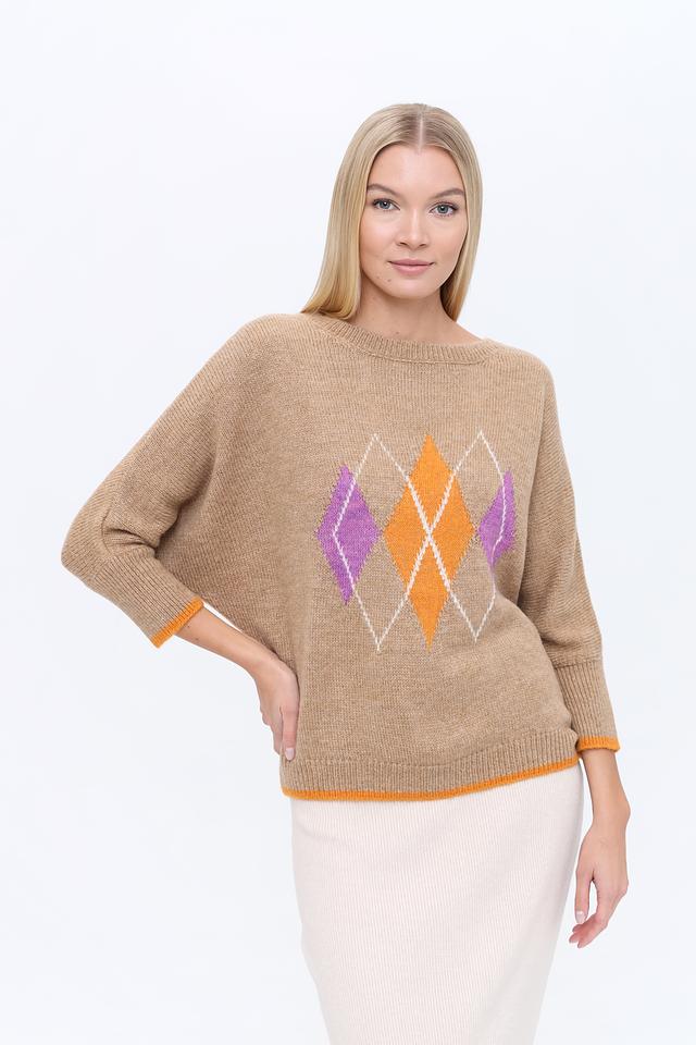 Этот пуловер от MORE and MORE выполнен в бежевом цвете и украшен ярким ромбовидным узором, выполненным в оранжевых и лиловых тонах. Модель имеет свободный крой и рукава 3/4, что делает ее универсальной для создания различных образов.