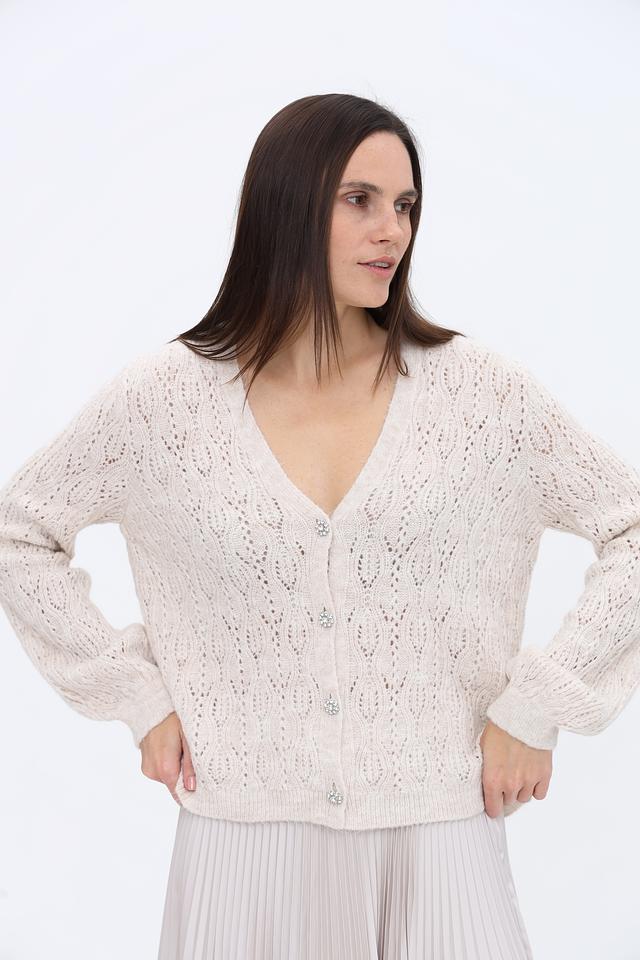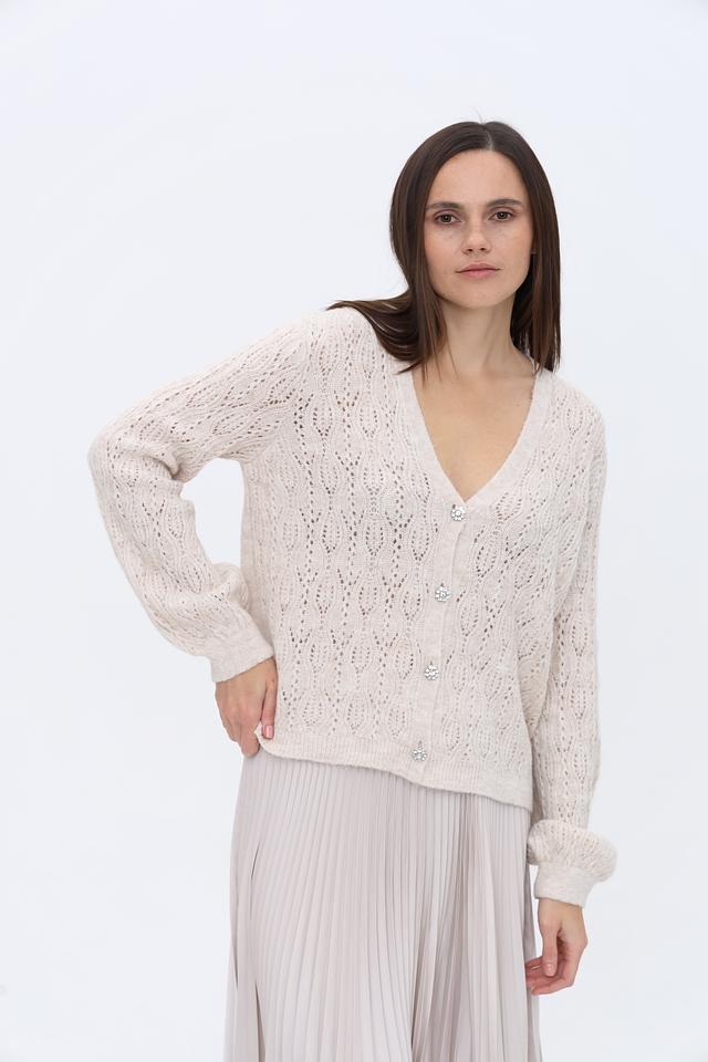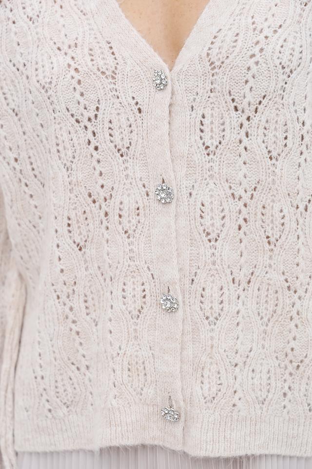 Модель имеет V-образный вырез, длинные рукава и застёжку на ряд пуговиц. Ажурный узор придает кардигану легкость и воздушность.