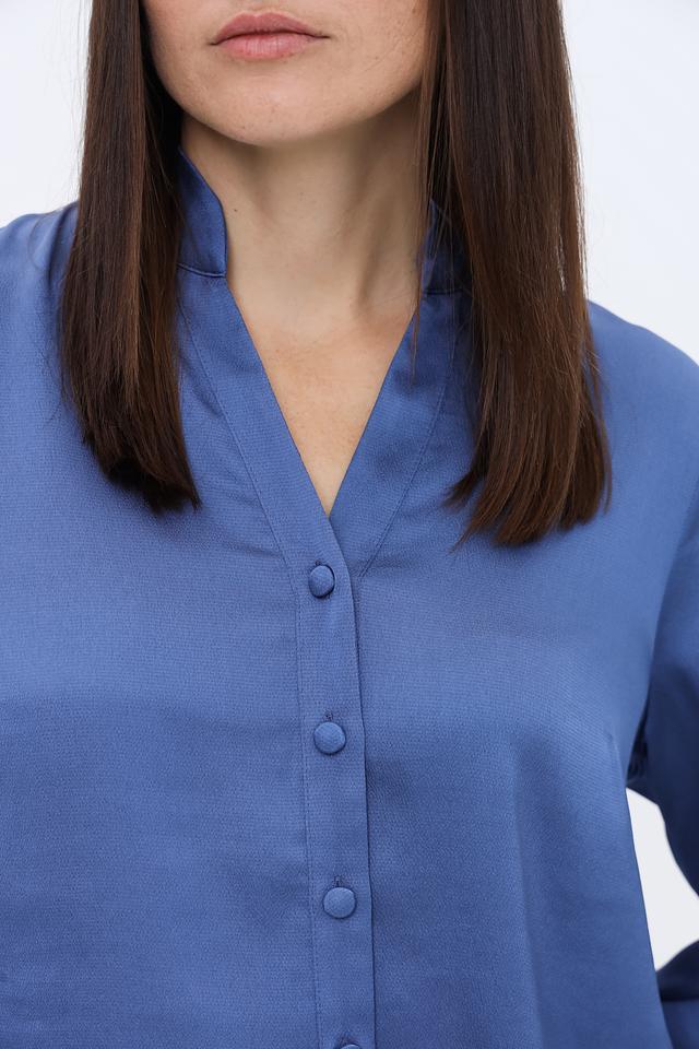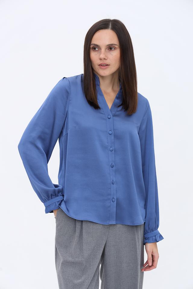 Модель имеет V-образный вырез, который визуально удлиняет шею и делает силуэт более изящным. Рукава блузы – фонарики, что добавляет образу романтичности и оригинальности. Застёжка выполнена на ряд пуговиц по всей длине переда.