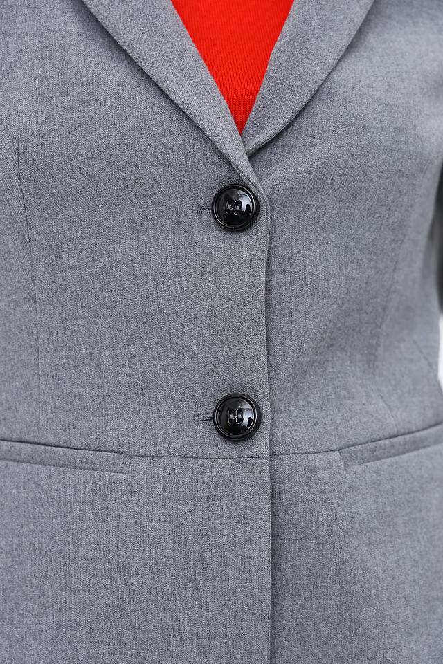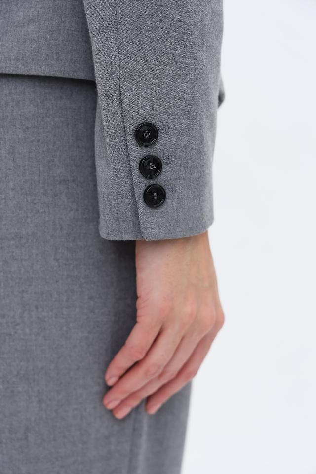 Жакет имеет приталенный силуэт, который подчеркивает фигуру, и застегивается на две пуговицы. Классический отложной воротник добавляет элегантности образу. Длинные рукава с аккуратными манжетами завершают образ.