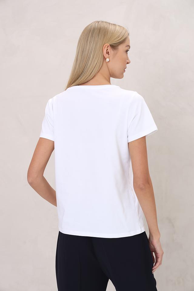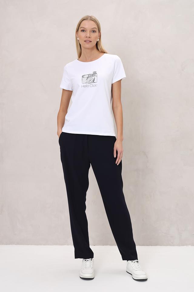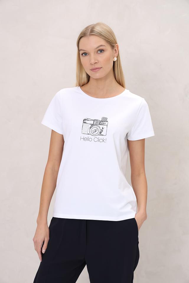Белая футболка More and More с оригинальным принтом в виде фотоаппарата и надписью "Hello Click!". Изготовлена из мягкого хлопка с добавлением эластана для комфорта и хорошей посадки. Состав: хлопок 95%, эластан 5%