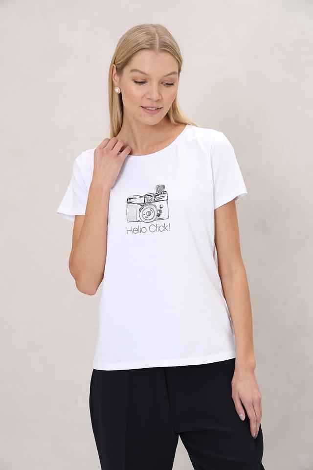 Основной цвет футболки – белый, что делает ее универсальной и легко сочетаемой с другими элементами одежды. На передней части футболки расположен оригинальный принт в виде фотоаппарата и надписи "Hello Click!".