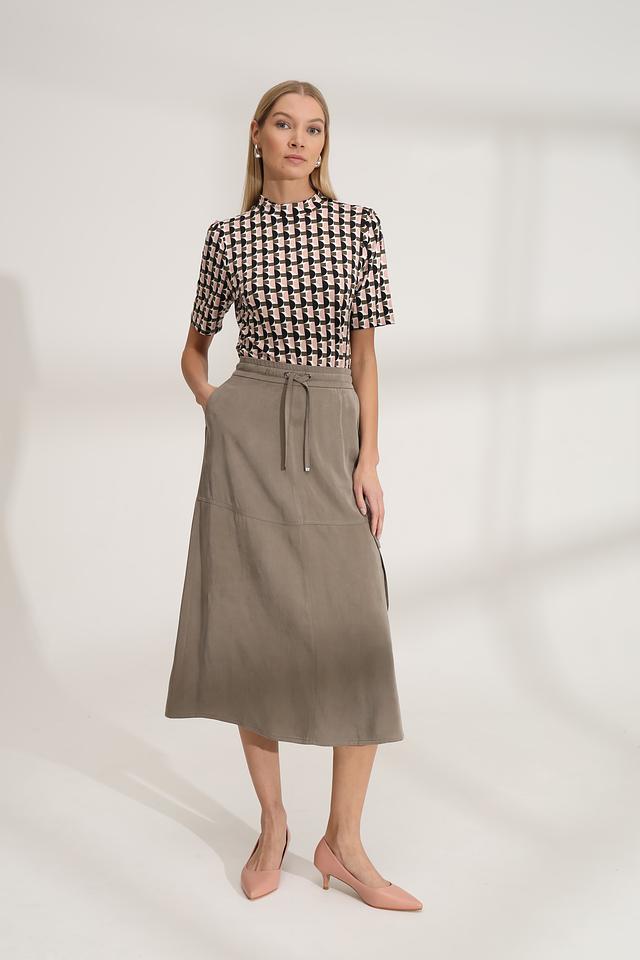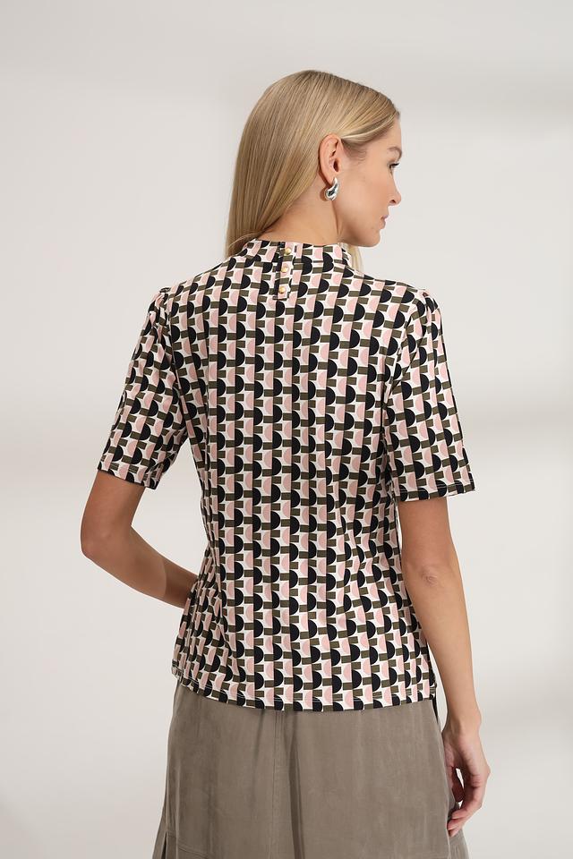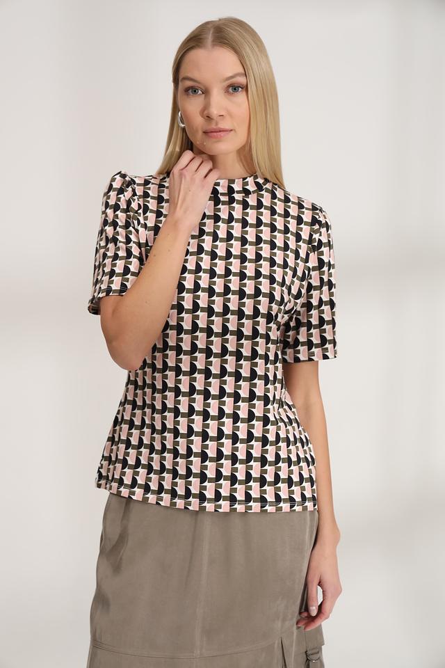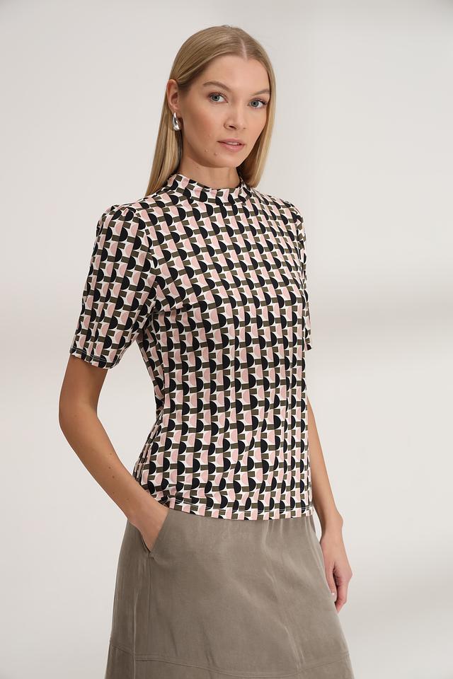 Эта блуза от More and More – идеальный выбор для создания элегантного и современного образа. Блуза выполнена в бежевой цветовой гамме и украшена выразительным геометрическим принтом, сочетающим в себе чёрные и розовые оттенки.