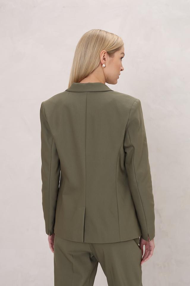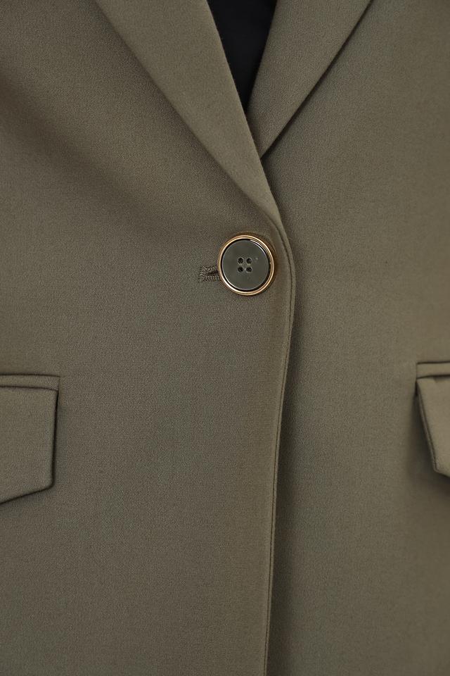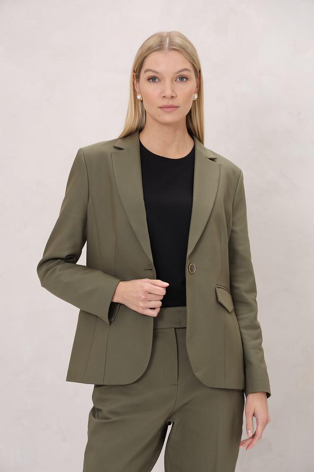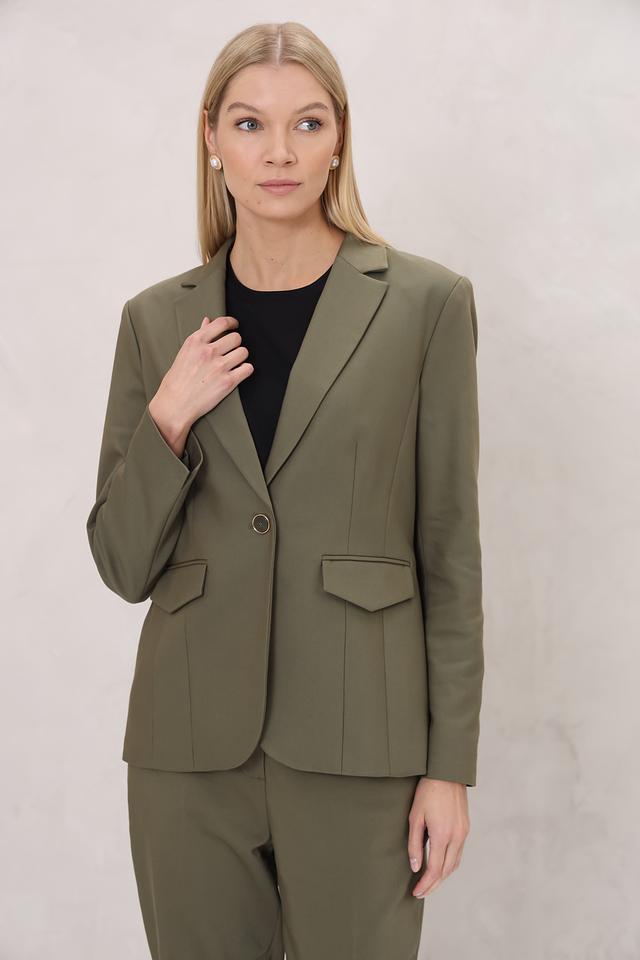 Жакет имеет классический крой с лацканами, однобортную застежку на одну пуговицу и функциональные карманы. Прямой силуэт обеспечивает комфортную посадку по фигуре. Жакет дополнен аккуратными деталями, подчеркивающими его элегантный стиль.