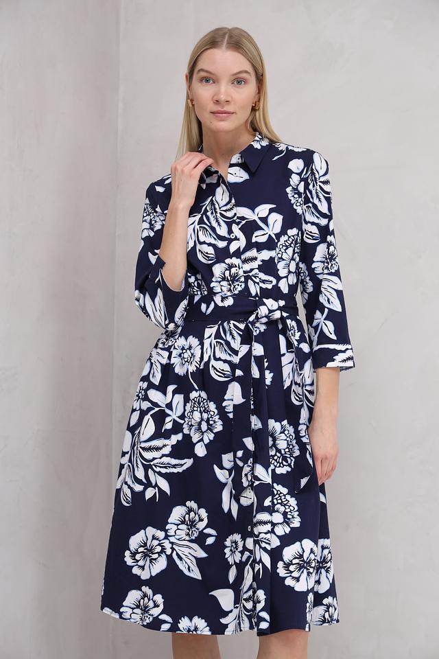 Платье More and More темно-синего цвета с ярким цветочным принтом – идеальный выбор для создания женственного и стильного образа. Модель с воротником-стойкой, рукавами 3/4 и поясом подчеркивает талию и создает элегантный силуэт. Состав: хлопок 97%, эластан 3%