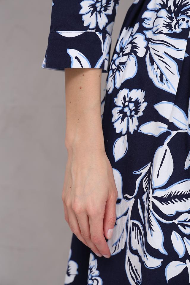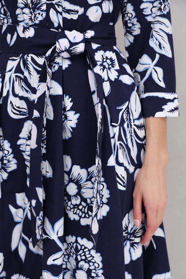 Яркий цветочный принт на темно-синем фоне делает это платье особенно привлекательным и подходящим для различных случаев – от повседневной носки до особых мероприятий. Состав ткани: хлопок 97%, эластан 3%.