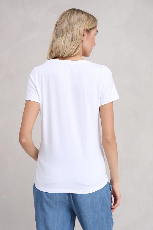 Белая футболка от MORE and MORE с оригинальным принтом в виде абстрактного изображения лица и цветов. Изготовлена из мягкого и приятного к телу сочетания хлопка, модала и эластана, обеспечивающего комфорт при носке. Состав: хлопок 48%, модал 48%, эластан 4%
