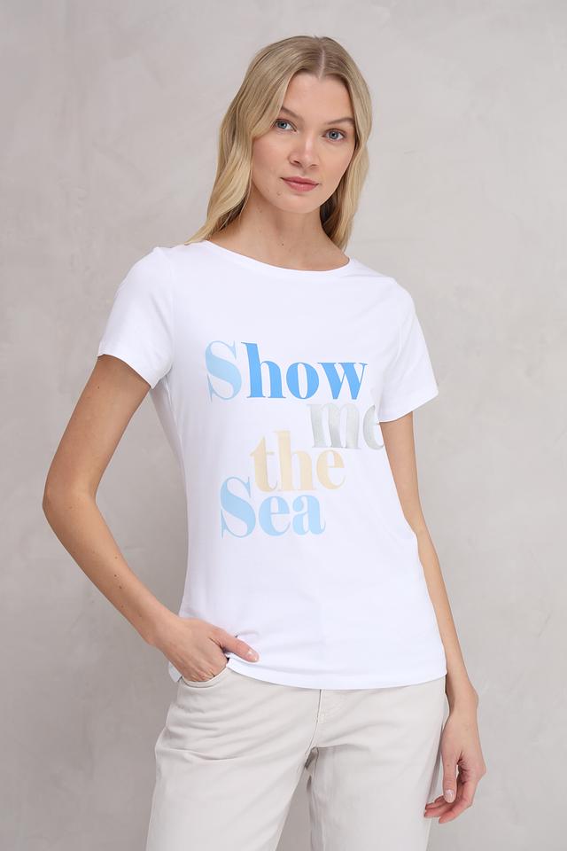 Эта стильная футболка от бренда More and More выполнена из высококачественного хлопка с добавлением эластана, что обеспечивает комфорт в носке и сохранение формы. Преобладающий цвет – белый, а акцент сделан на ярком принте с надписью "Show the Sea" в голубых тонах.