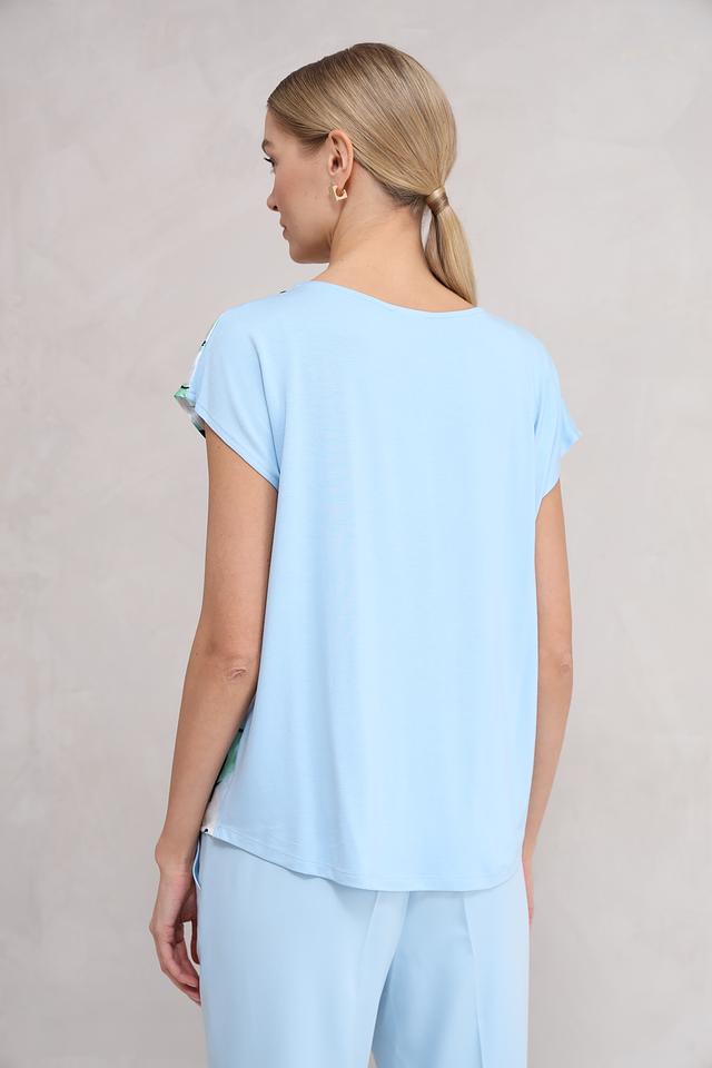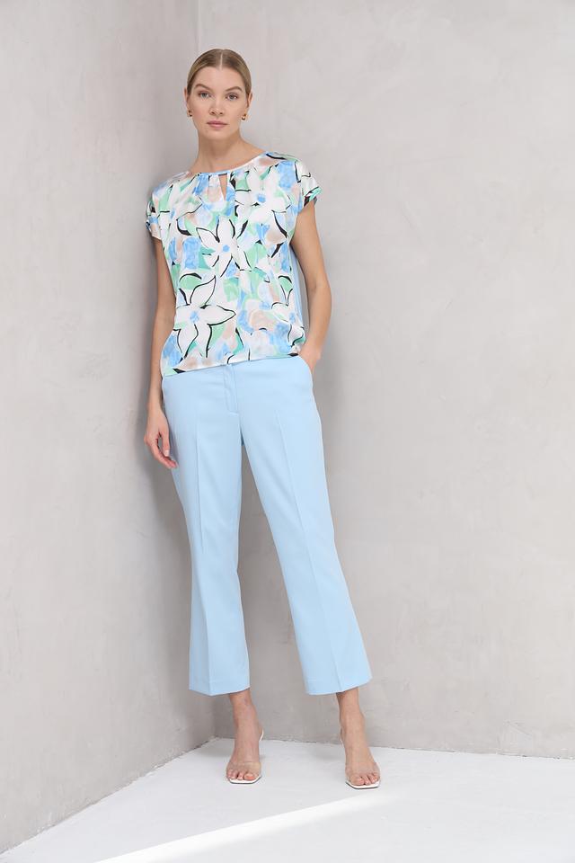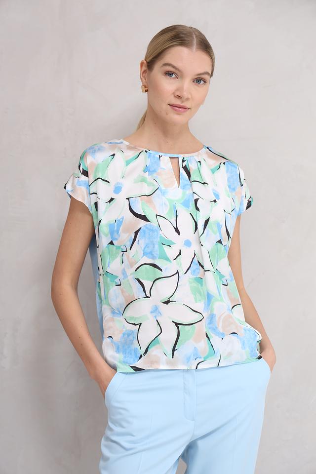 Блуза More and More голубого цвета с ярким цветочным принтом станет отличным дополнением к вашему гардеробу. Модель выполнена из лёгкой вискозы с добавлением эластана, что обеспечивает комфорт и удобство в носке. Состав: вискоза 95%, эластан 5%