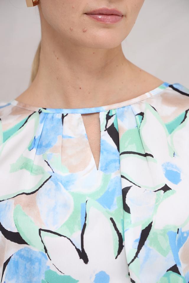 Особенностью данной модели является яркий цветочный принт, который добавляет свежести и оригинальности. Вырез горловины оформлен небольшим V-образным разрезом, что придает блузе изящность. Короткие рукава делают её идеальной для теплой погоды.