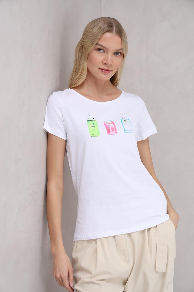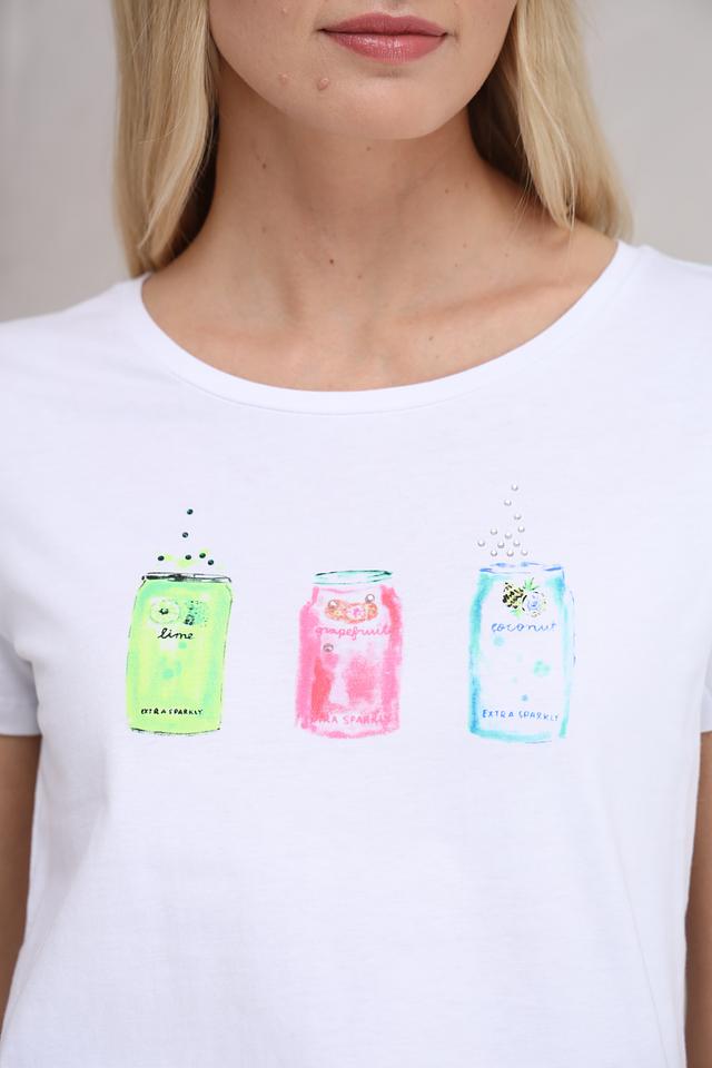 Основной цвет футболки – белый, который служит идеальным фоном для яркого и оригинального принта. На передней части футболки изображены четыре банки с напитками: лайм, грейпфрут, кокос и ещё одна банка с неясным напитком, выполненные в ярких цветах – лаймовом, розовом и голубом.