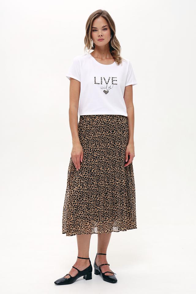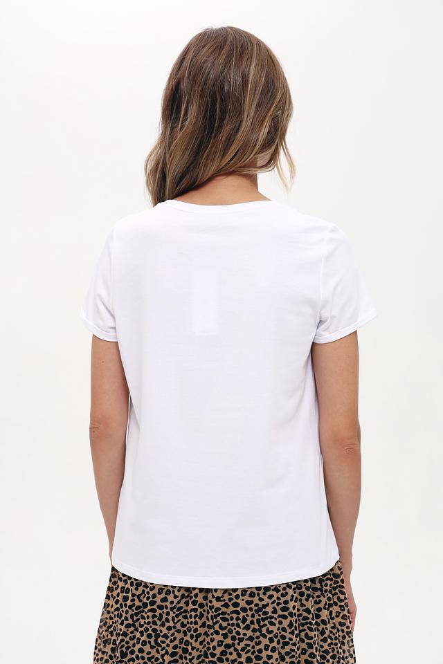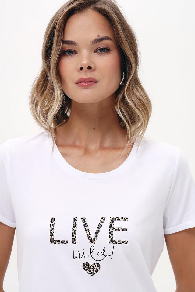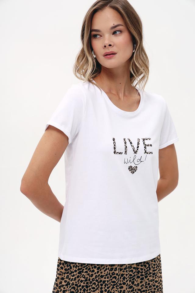 Белая футболка More and More с оригинальным принтом "Live Wild!" в леопардовом исполнении. Изготовлена из мягкого и приятного к телу сочетания хлопка, модала и эластана, обеспечивающего комфорт при носке. Состав: хлопок 48%, модал 48%, эластан 4%