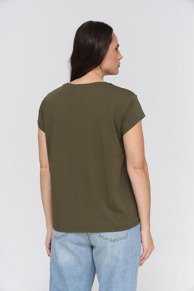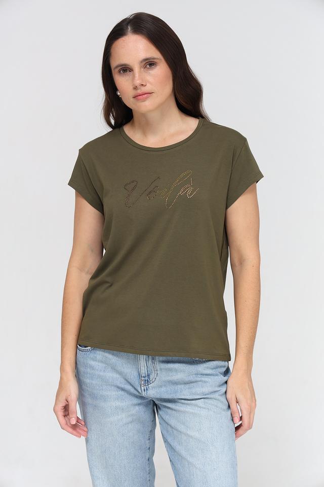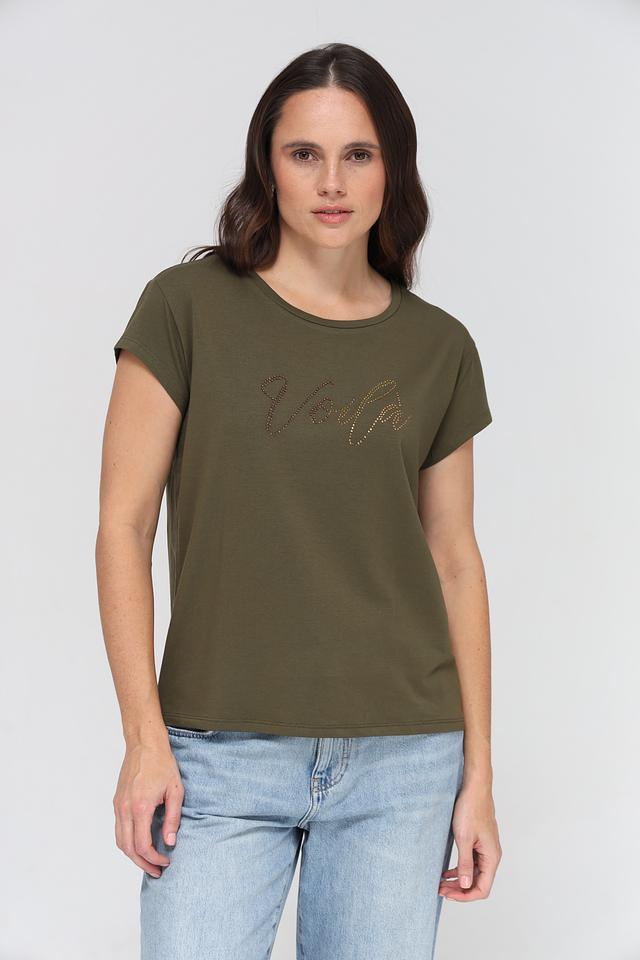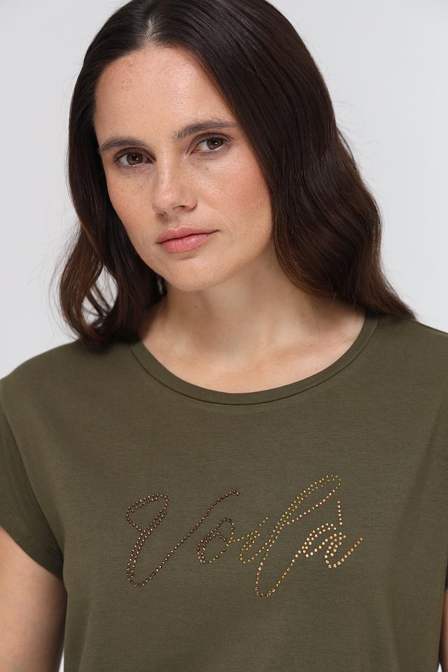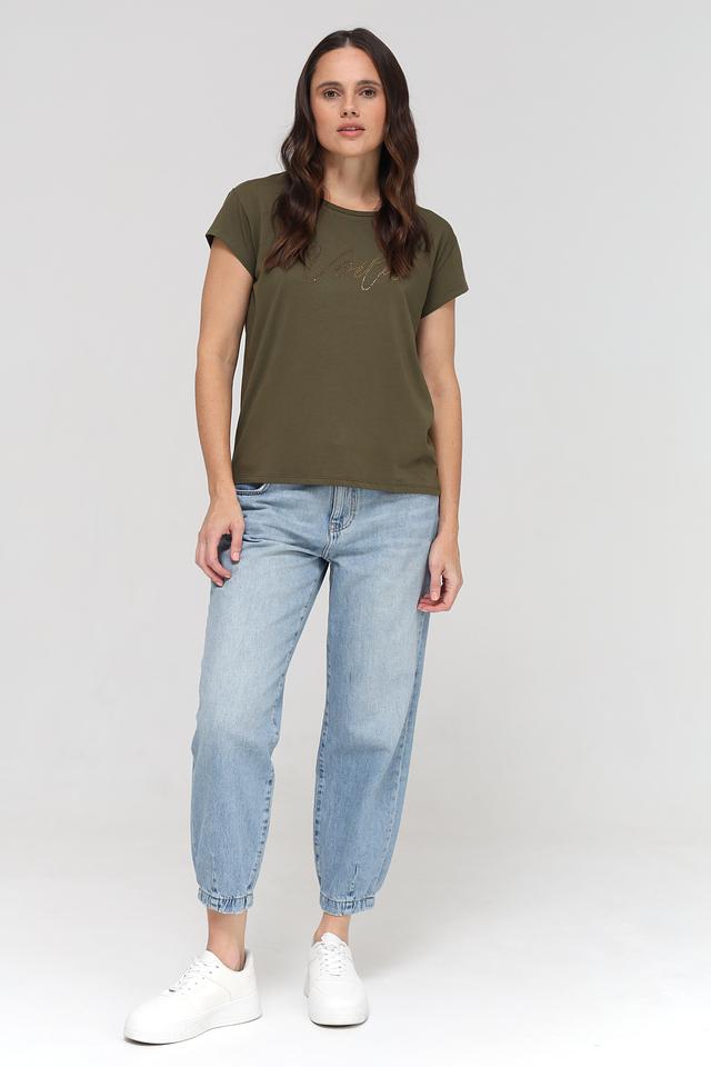 Женская футболка More and More хаки цвета с декоративной вышивкой "Voilà". Модель выполнена из мягкого и приятного к телу сочетания хлопка и модала, обеспечивающего комфорт в носке. Состав: хлопок 48%, модал 48%, эластан 4%